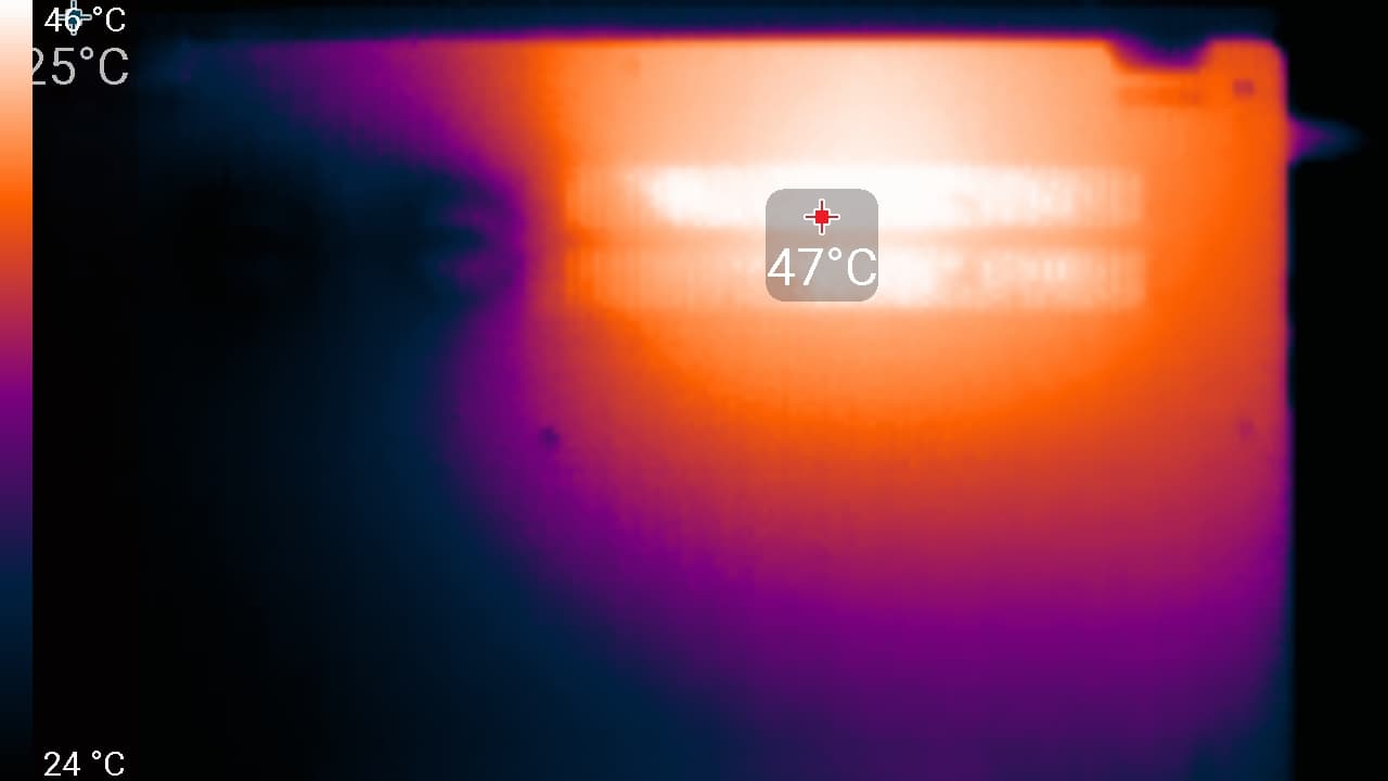 При питании от сети или от батареи и при ручном управлении яркостью ее максимальное значение в режиме SDR составило порядка 390 кд/м² (в центре экрана на белом фоне во весь экран). Максимальная яркость довольно высокая. Если избегать прямого солнечного света, то даже такое значение позволит с относительным комфортом использовать ноутбук на улице летним солнечным днем.