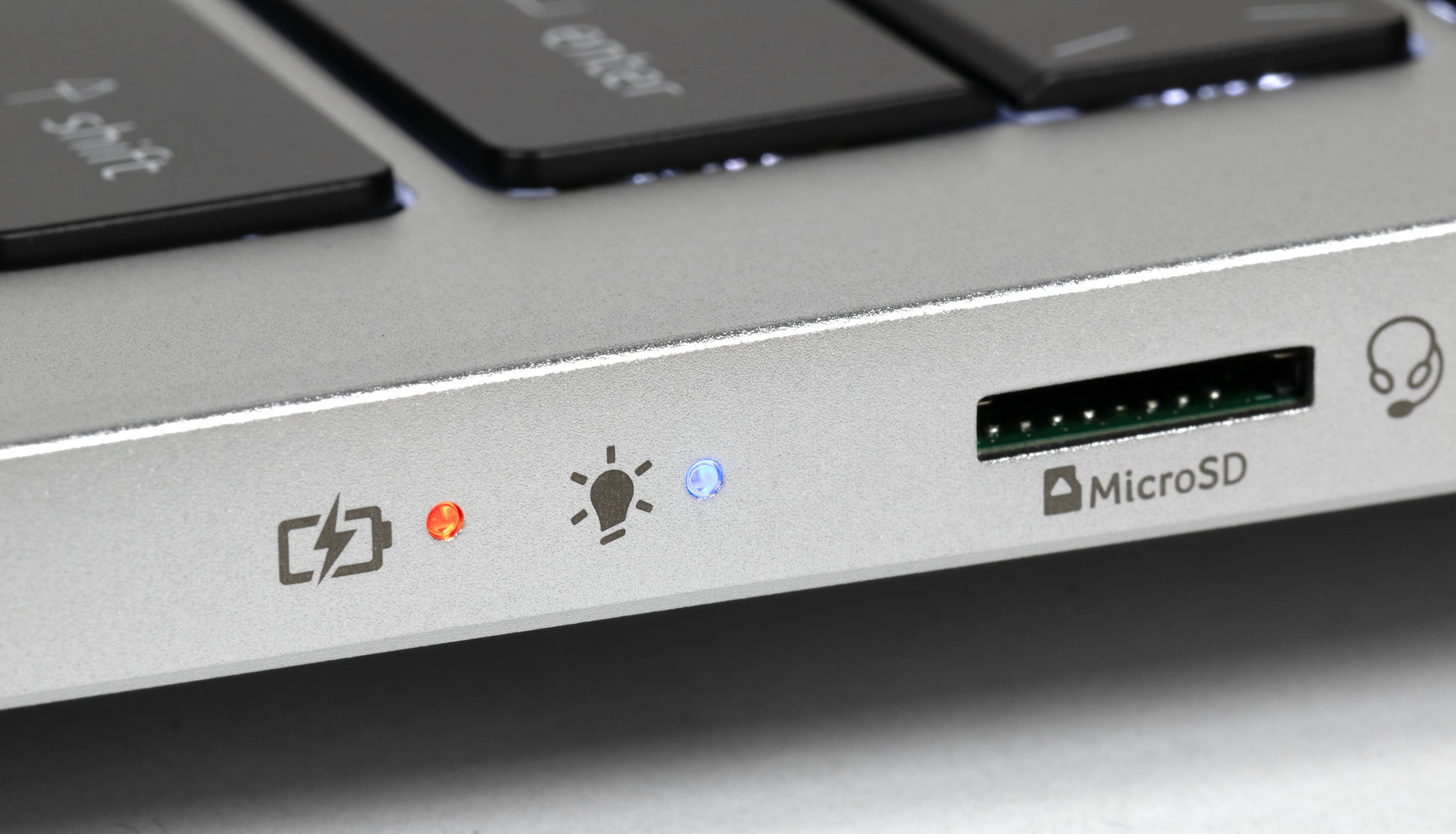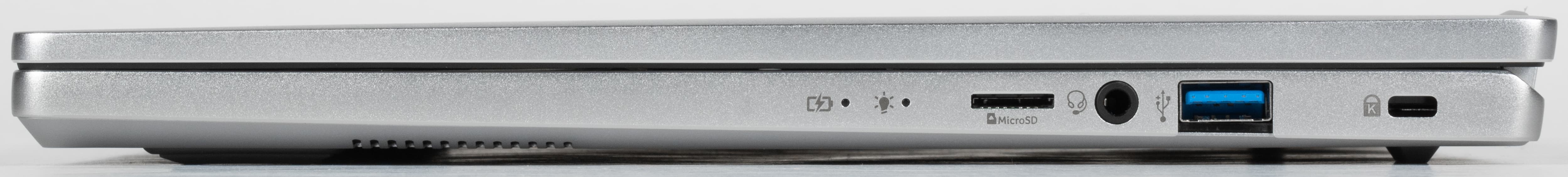 На правой боковой панели имеются два светодиодных индикатора (зарядки батареи и запуска ноутбука), слот картовода для microSD, комбинированный аудиоразъем, еще один порт USB Type-A и кенсингтонский замок.
