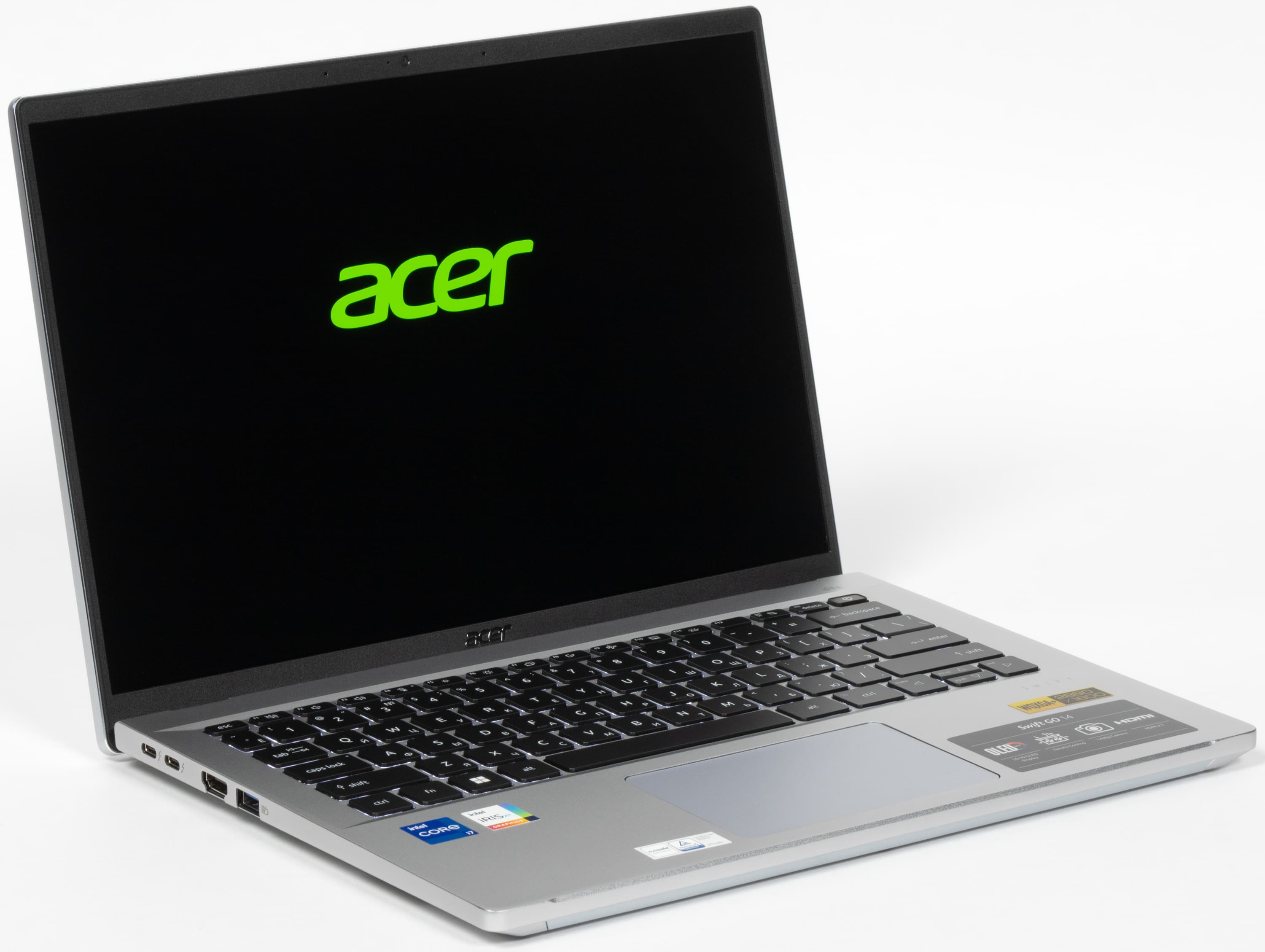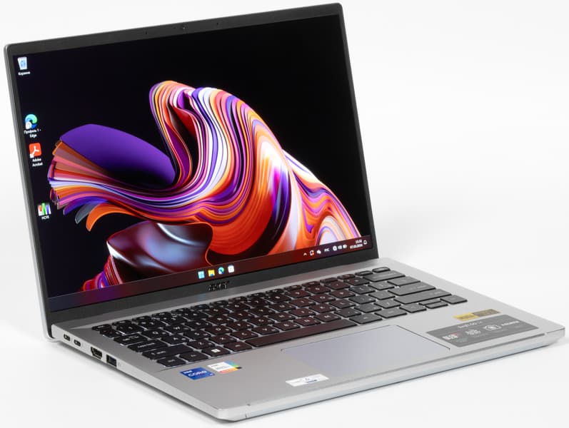 Отличительными особенностями Acer Swift Go 14 являются металлический корпус, 14-дюймовый экран OLED с высоким разрешением и соотношением сторон 16:10, более совершенная, чем у подавляющего большинства конкурентов, веб-камера (1440p), а также набор из двух высокоскоростных портов USB 4/Thunderbolt 4 с поддержкой Power Delivery и DisplayPort 1.4. Это при наличии полноценного HDMI дает возможность подключить до трех внешних мониторов одновременно. К слабым сторонам конфигурации отнесем отсутствие шторки у веб-камеры и цифрового блока у клавиатуры (но у 14-дюймовых ноутбуков они и не встречаются).
