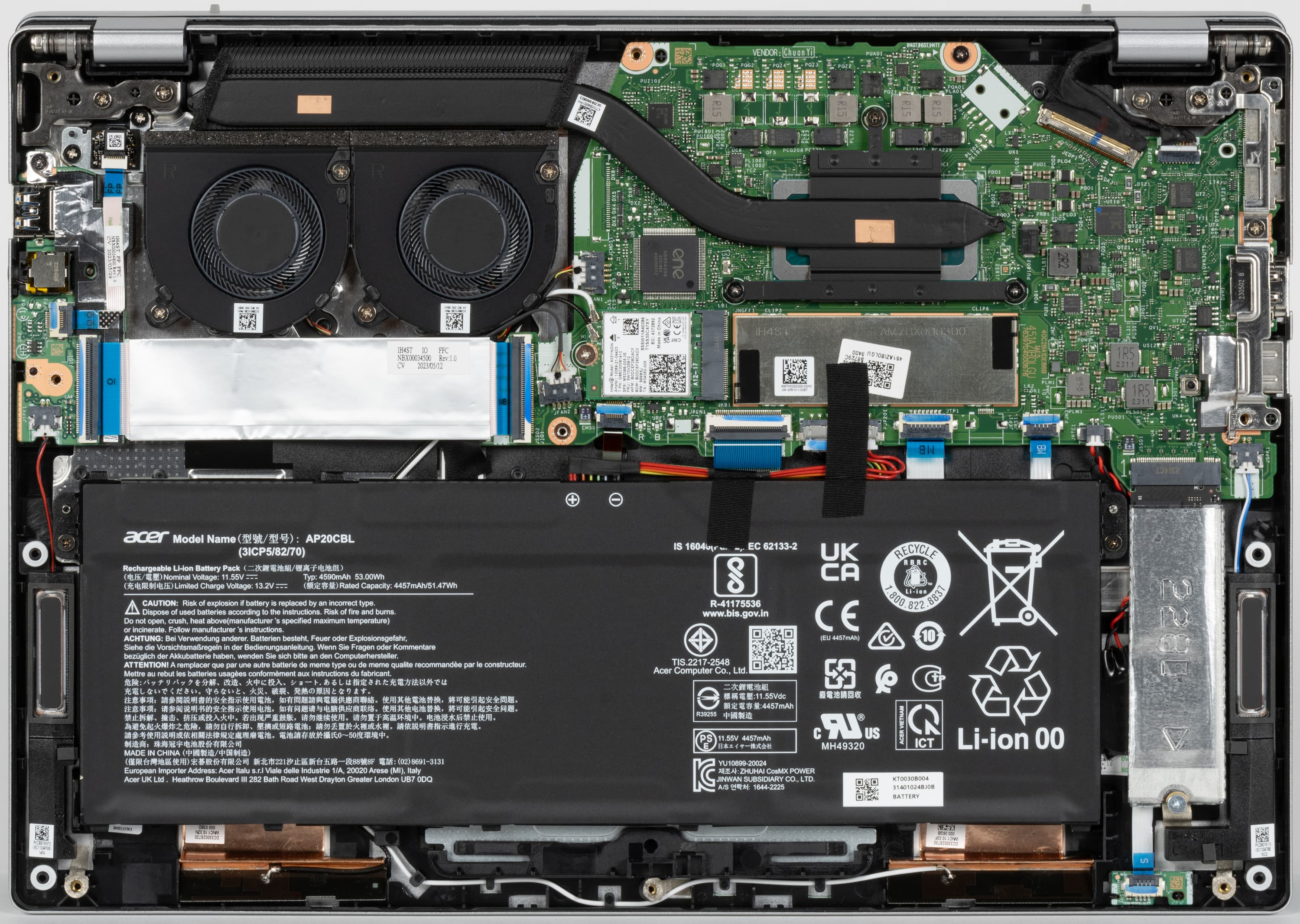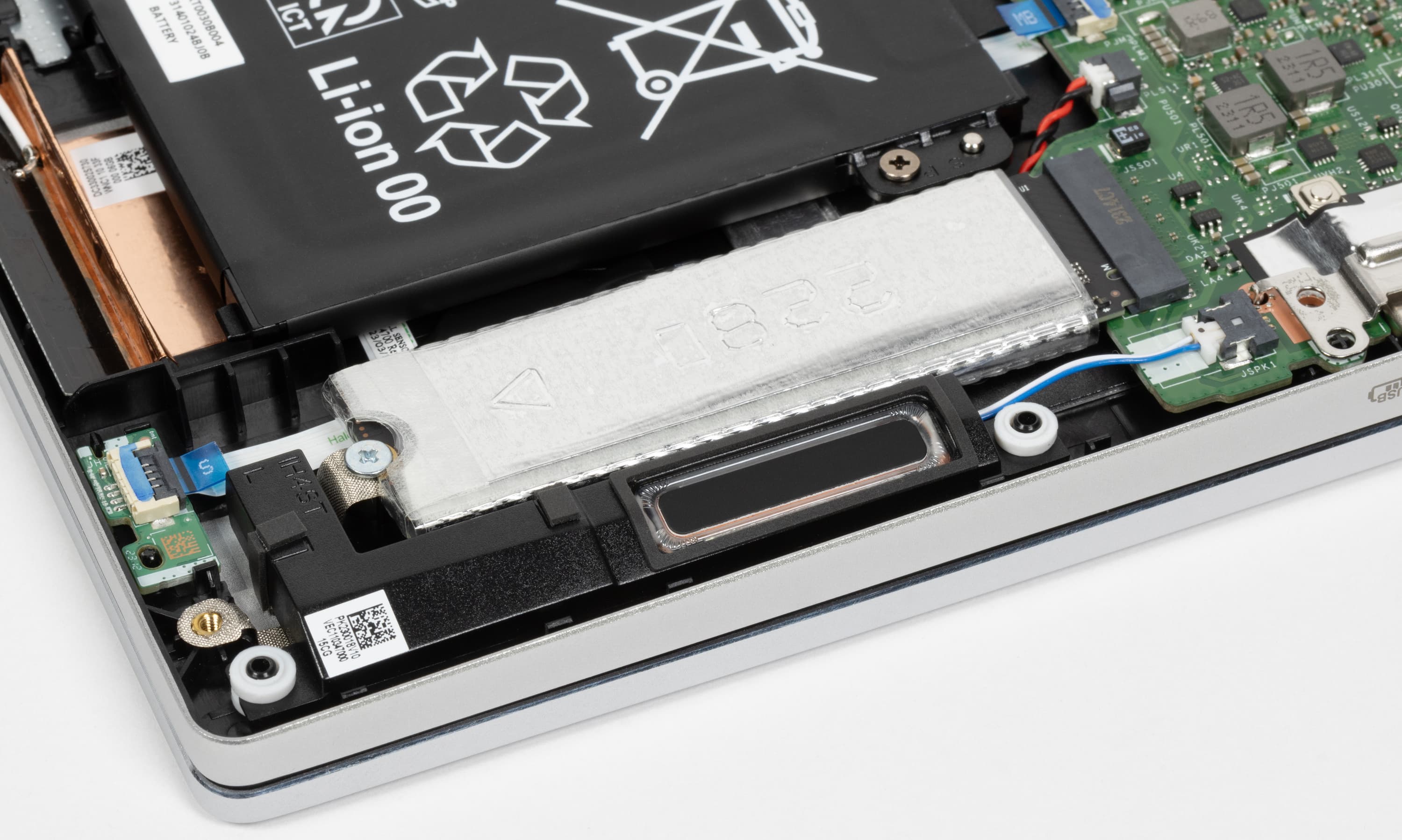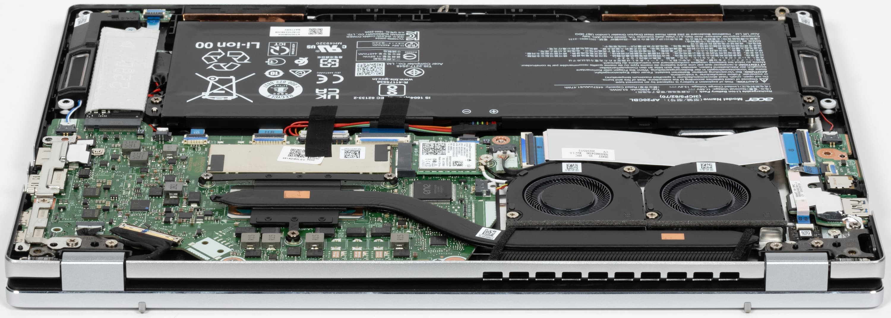 Свободного пространства внутри корпуса почти нет. Наиболее заметными компонентами являются двухвентиляторная система охлаждения, системная плата, аккумулятор и суппорты громкоговорителей. Плата двухкомпонентная: к основной части шлейфом подключен правый сателлит (на фото — слева).
