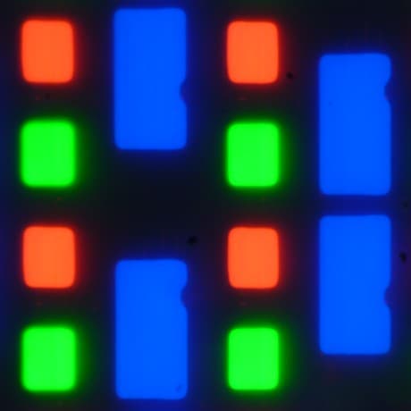 В данном экране используется матрица типа AMOLED — активная матрица на органических светодиодах. Полноцветное изображение создается с помощью субпикселей трех цветов — красного (R), зеленого (G) и синего (B) в равном количестве — по три разного вида на пиксель. Это подтверждается фрагментом микрофотографии (синий субпиксель сдвоенный):