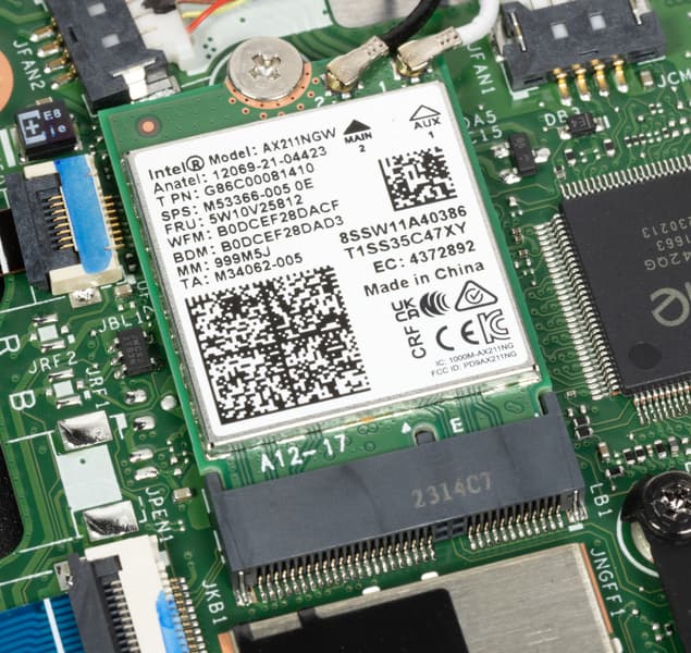 Беспроводная связь реализована давно известным и хорошо себя зарекомендовавшим трехдиапазонным (2,4/5/6 ГГц) адаптером Intel AX211NGW (Garfield Peak), сертифицированным как устройство Wi-Fi 6E с поддержкой стандартов IEEE 802.11ax и возможностями одновременного приема и передачи данных с использованием двух антенн при множественных подключениях (2×2 MIMO). Этот же компонент обеспечивает связь по Bluetooth 5.3. Адаптер установлен в слоте M.2, поэтому при желании на его место можно установить нечто более совершенное (хотя и имеющееся в комплекте решение на сегодняшний день более чем адекватное). Кстати, после аккумулятора это второй и последний аппаратный компонент, подлежащий замене.