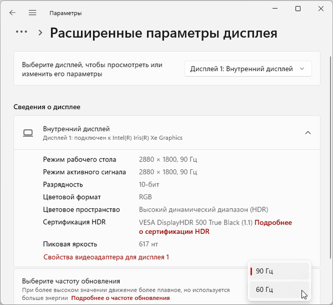 В настройках экрана доступны две частоты обновления — 60 и 90 Гц:
