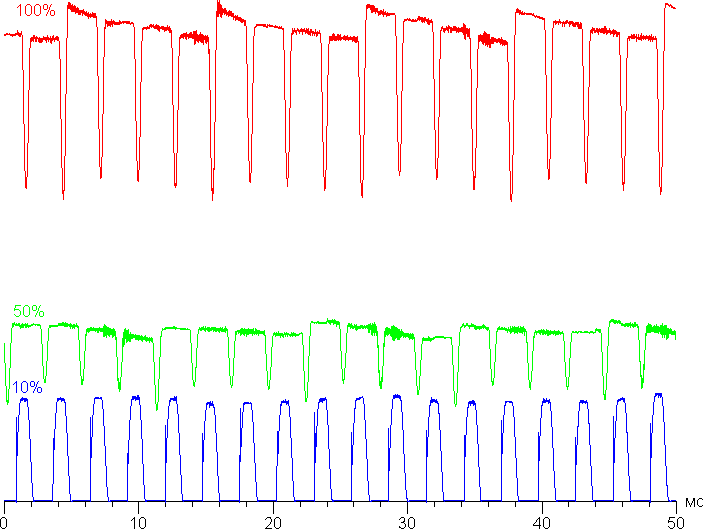 На любом уровне яркости присутствует значимая модуляция с частотой 360 Гц. На рисунке ниже приведены зависимости яркости (вертикальная ось) от времени (горизонтальная ось) для нескольких значений настройки яркости (зависимость реальной яркости от %% шкалы нелинейная):