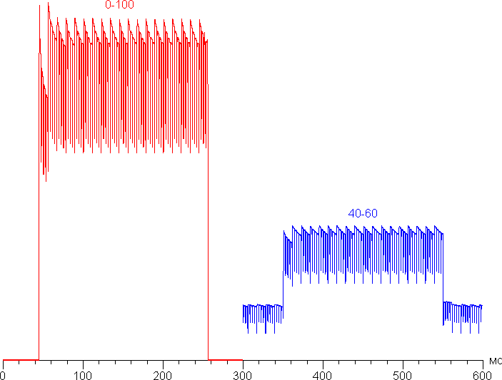 Переключение состояния элементов матрицы OLED выполняется практически мгновенно (порядка 0,2 мс для одного перехода), но на фронте включения и реже выключения может присутствовать ступенька шириной примерно 17 мс (что соответствует частоте обновления экрана в 60 Гц) или шириной примерно 11 мс (90 Гц). Например, так выглядит зависимость яркости от времени при переходе от черного к белому (график 0-100) и от серого к серому (40% — 60% по численному значению оттенка — график 40-60) и обратно (90 Гц):