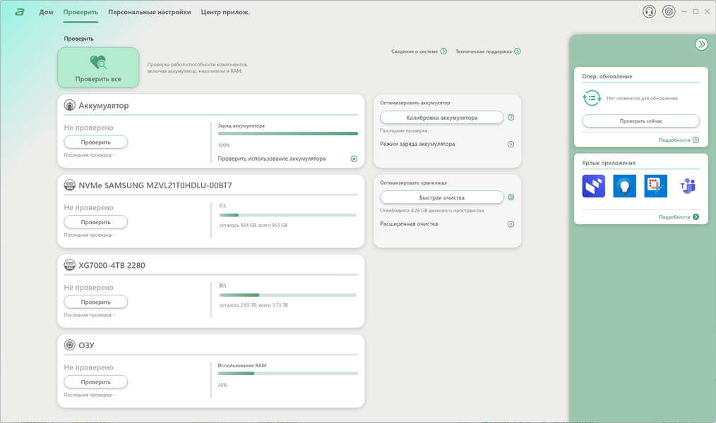 Возможности утилиты сгруппированы в четырех разделах (с закладками): «дом», «проверить», «персональные настройки», «центр приложений».