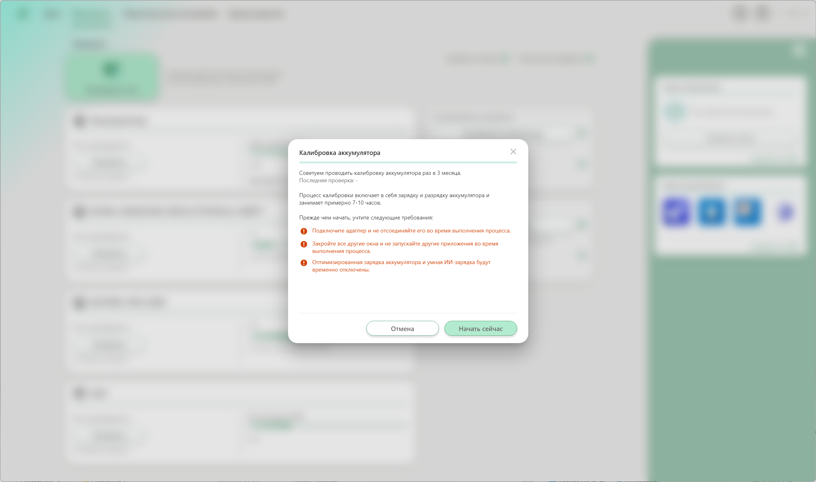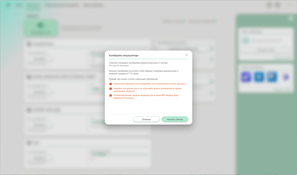 Доступна опция калибровки аккумулятора.