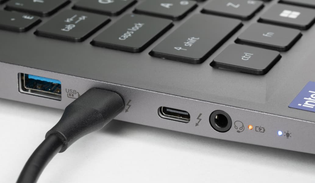 На левой боковой панели имеются видеовыход HDMI, порты USB 3.2 Gen2, два интерфейса Thunderbolt 4 / USB 4 Gen3 (Type-C) и комбинированный аудиоразъем для подключения гарнитуры.