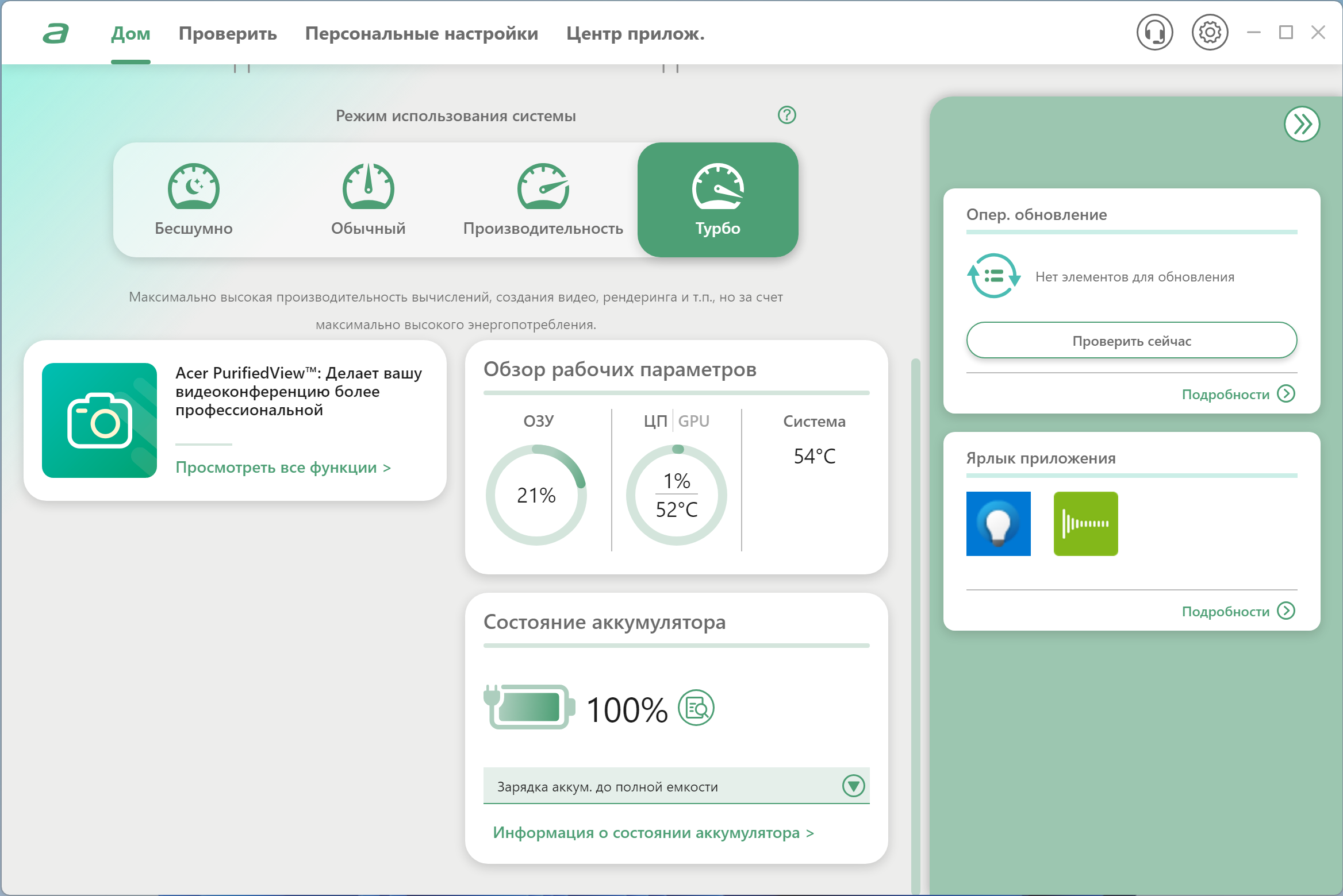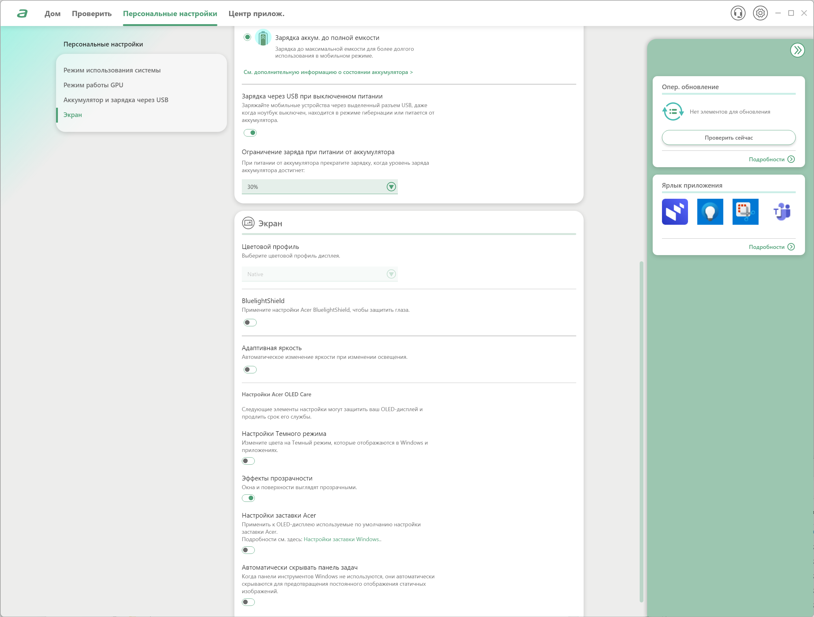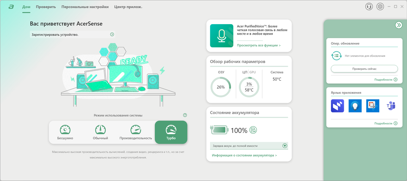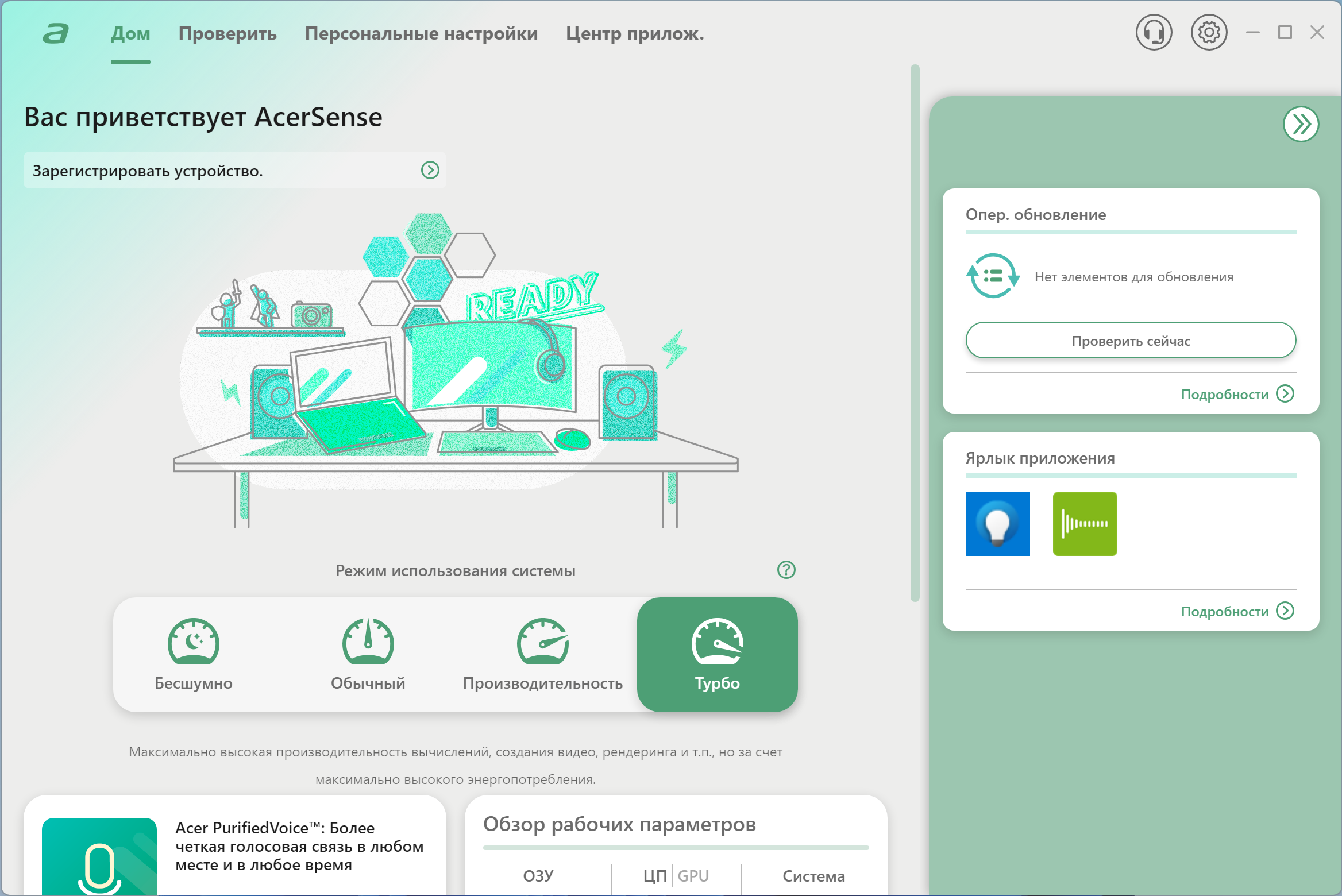 На первом экране можно сразу же определить пресет, проверить наличие обновлений и даже определить ярлык, который будет назначен самому приложению AcerSense.