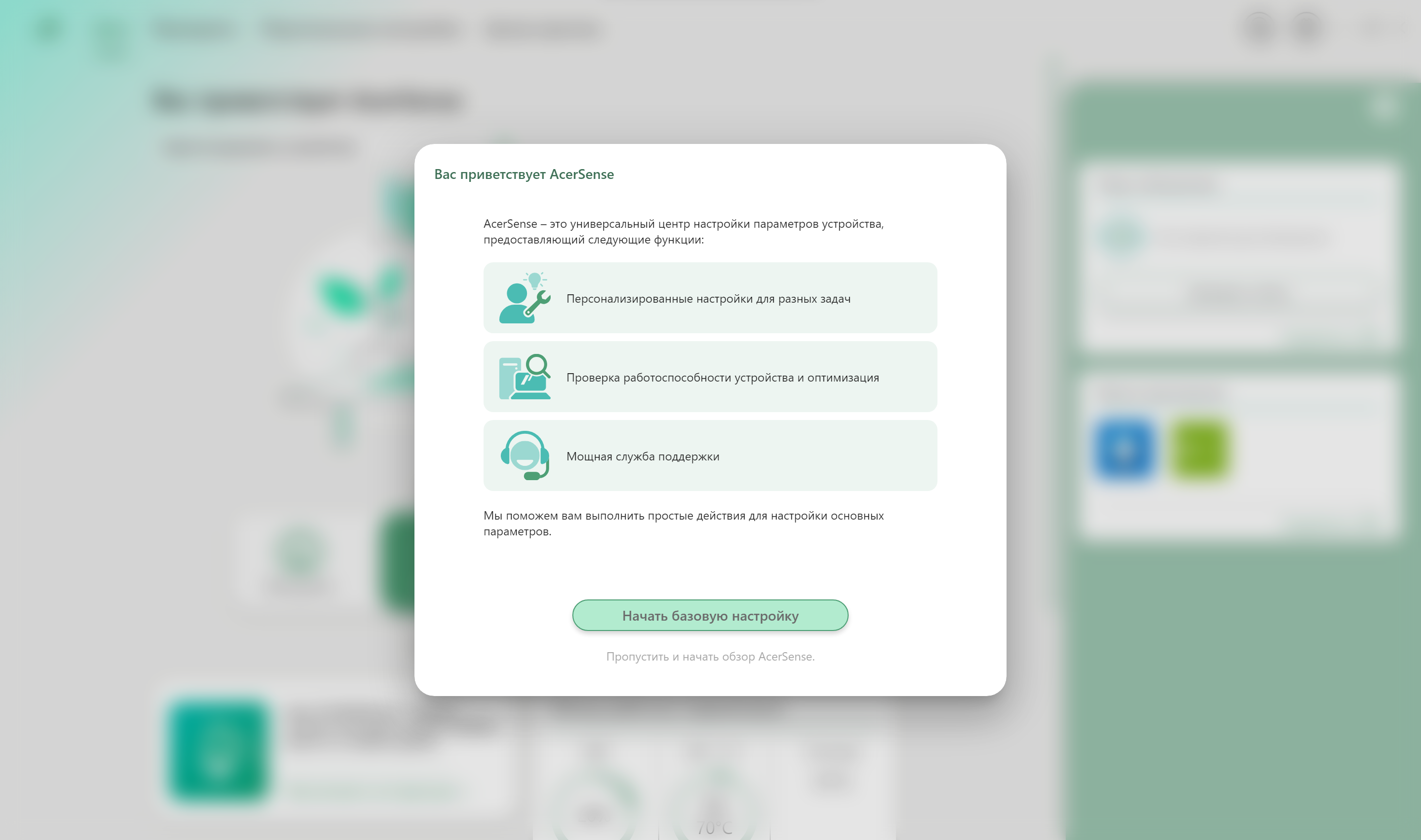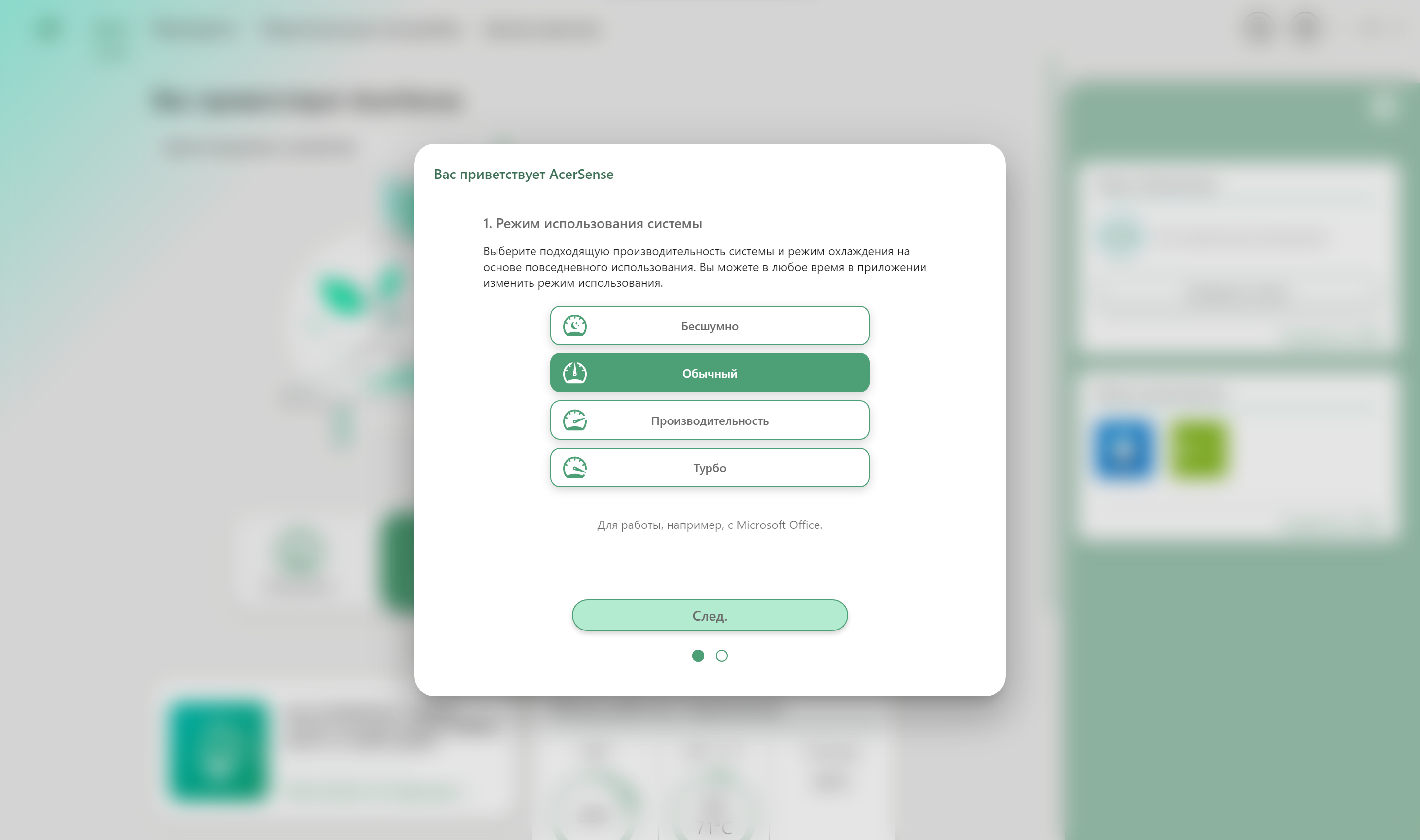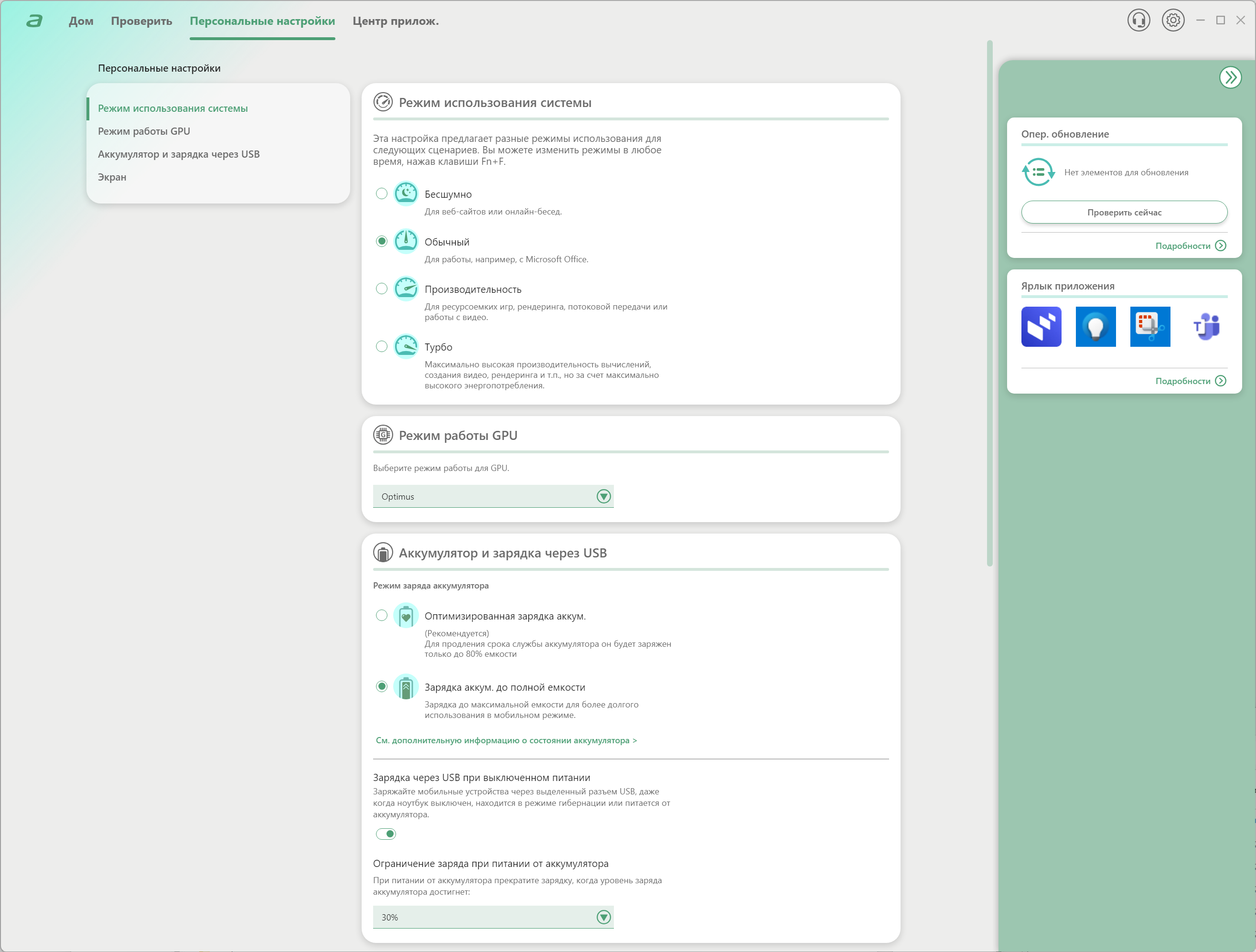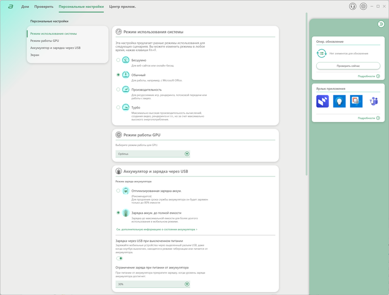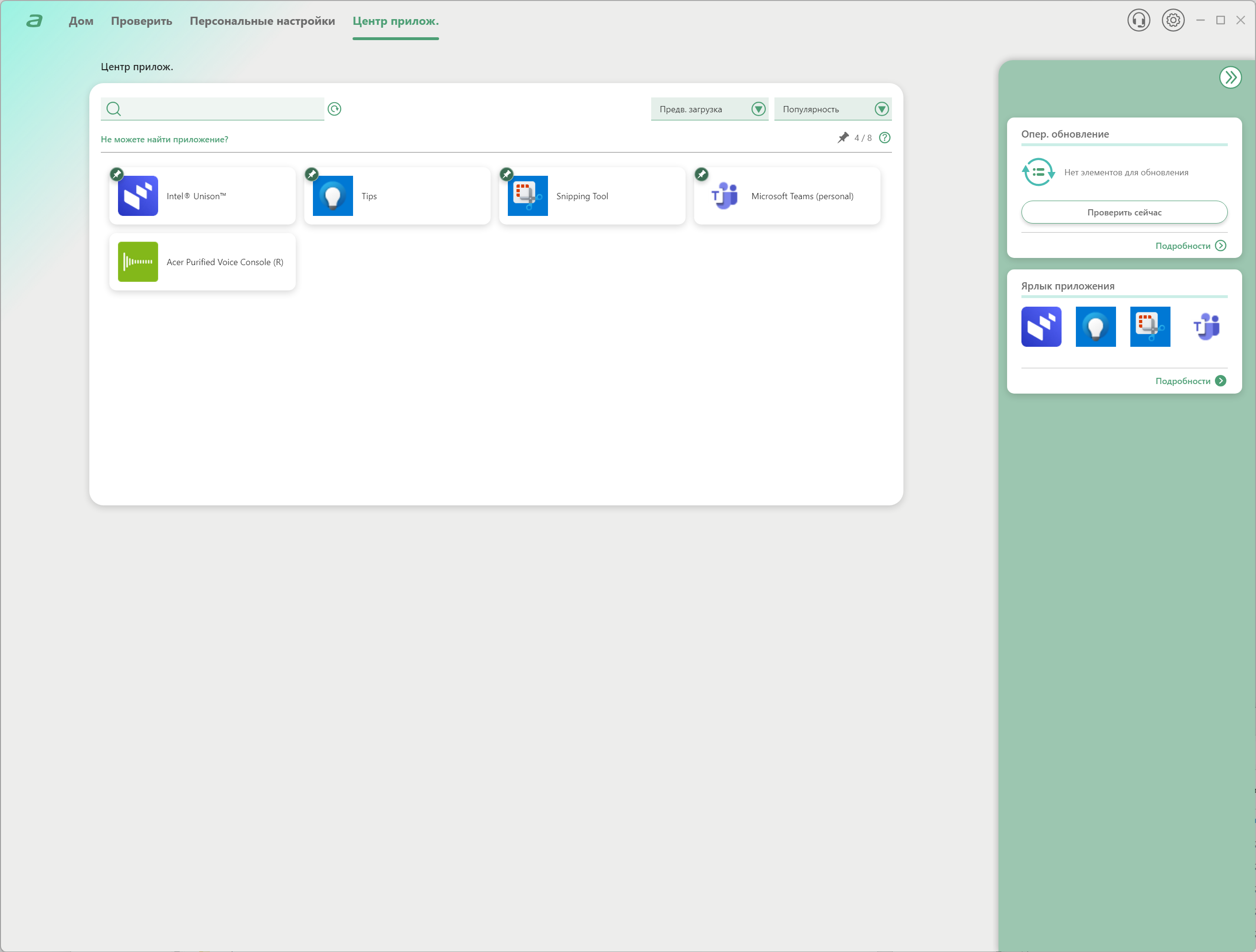 На первом экране можно сразу же определить пресет, проверить наличие обновлений и даже определить ярлык, который будет назначен самому приложению AcerSense.