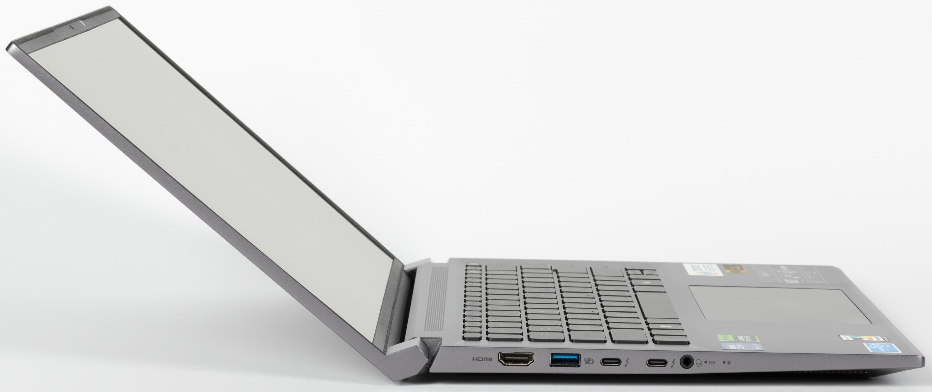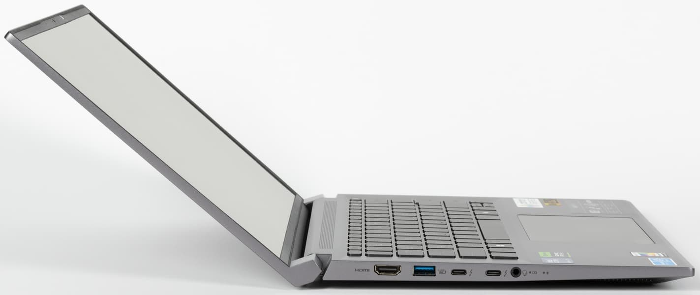 Привлекательными компонентами ноутбука для нас являются экран OLED с разрешением 2,8K, вполне современный CPU, достаточно привлекательная видеокарта (когда бы не ее пониженное потребление), 32 ГБ памяти, два порта Thunderbolt 4, которые вкупе с HDMI позволяют подключить к машине одновременно три внешних монитора (но для того, чтобы подключить еще и питание, придется использовать док-станцию).