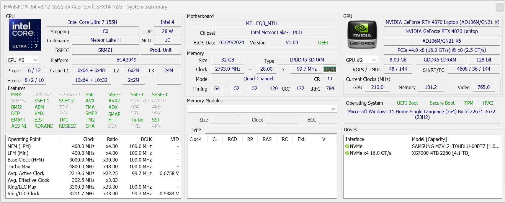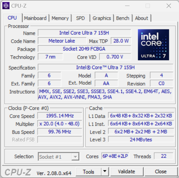 | Процессор | Intel Core Ultra 7 155H: 6 P-ядер/12 потоков 1,4/4,8 ГГц; 8 E-ядер/8 потоков, 0,9/3,8 ГГц; 2 LE-ядра/2 потока 0,7/2,5 ГГц; Intel AI Boost NPU; 20—28/115 Вт | |