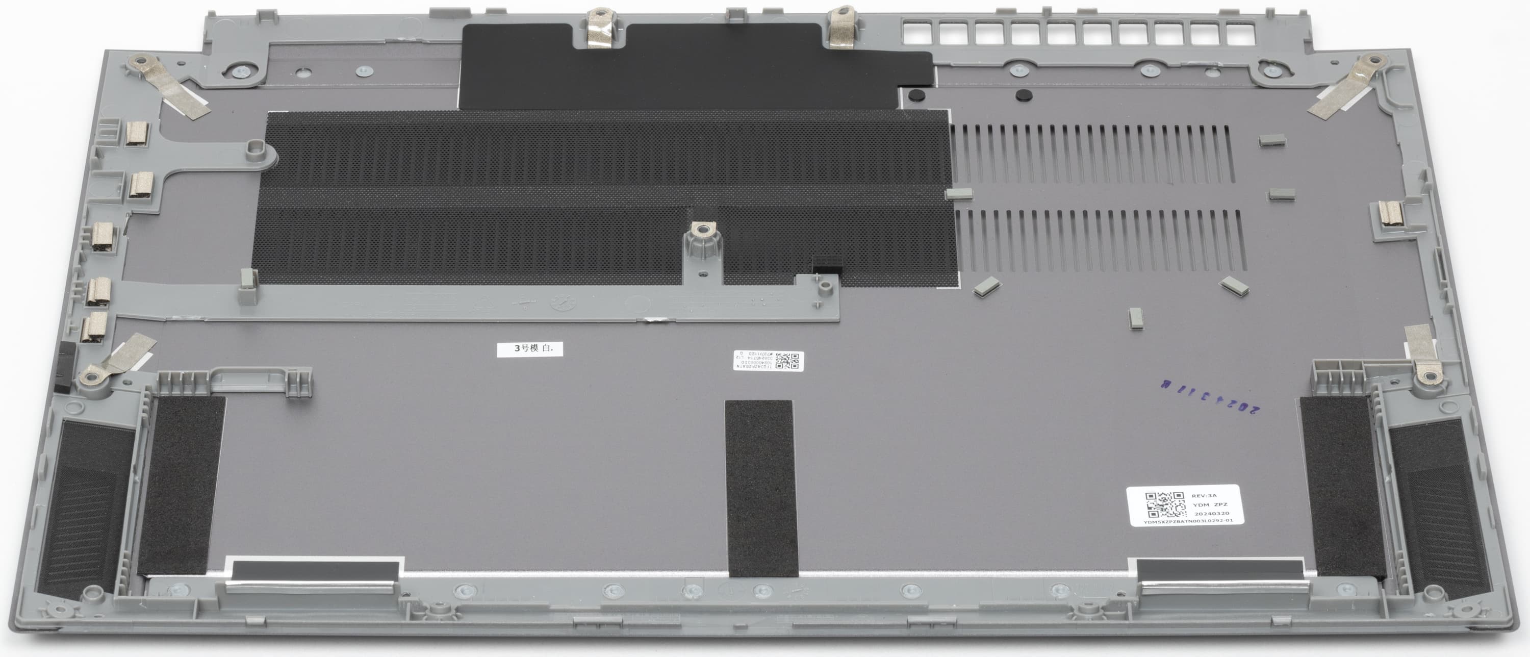 Изнутри на нижнюю крышку наклеены полоски поролона для амортизации соприкосновений днища с элементами внутреннего устройства ноутбука.