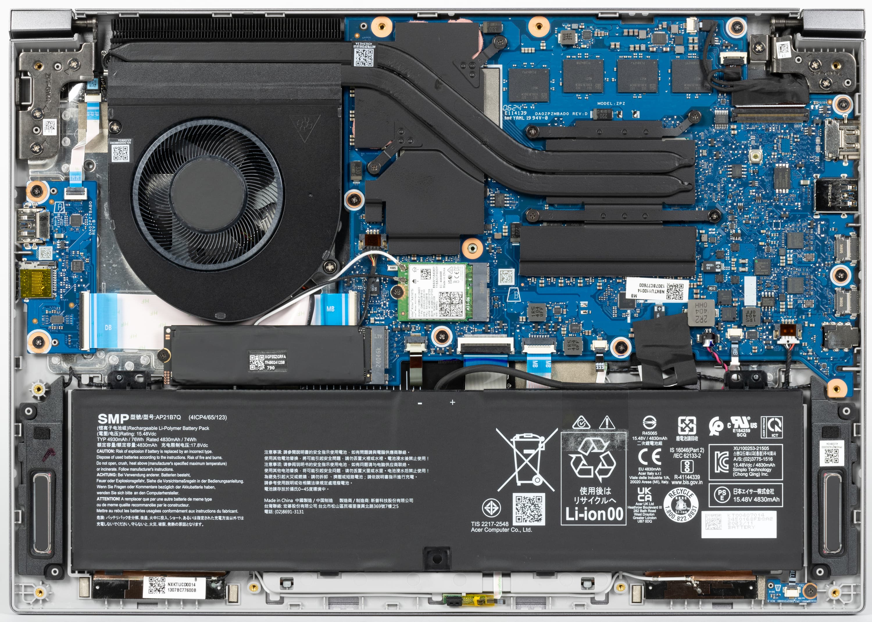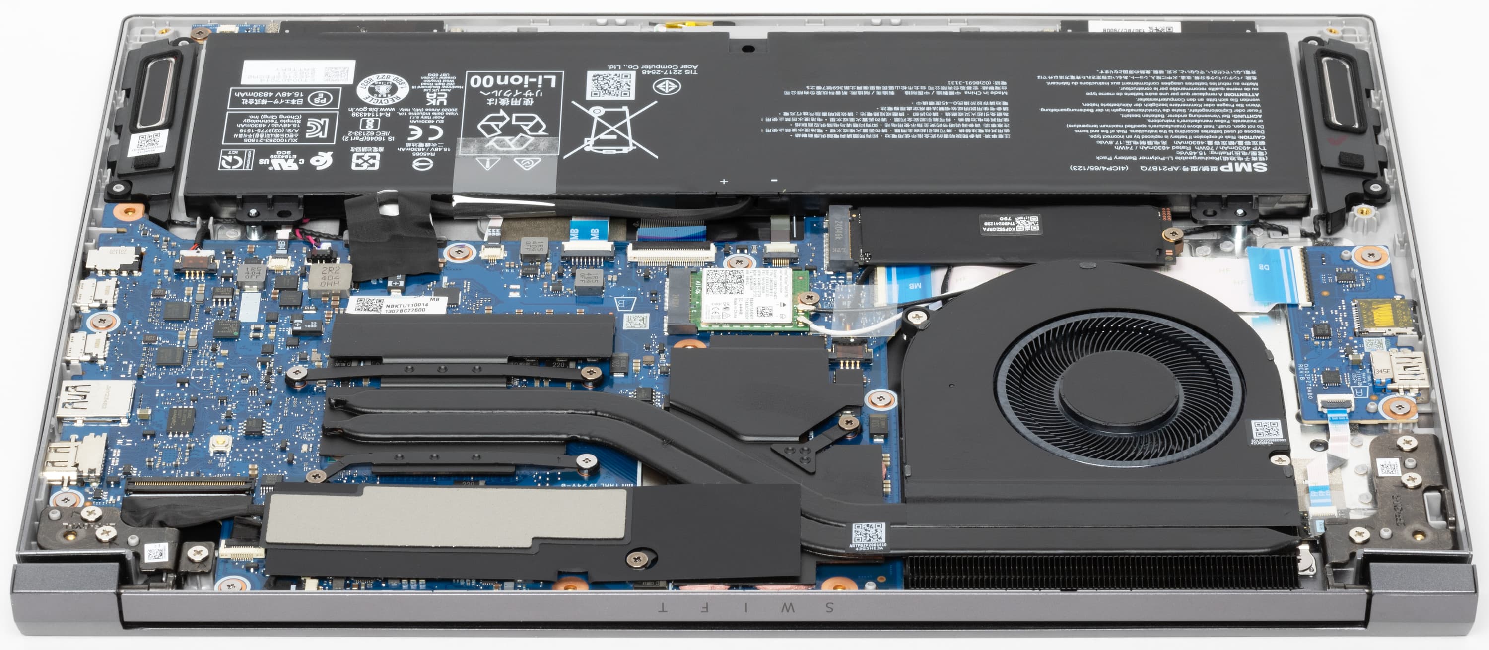 Во внутреннем объеме доминируют система охлаждения и аккумулятор. Аппаратная модернизация предусматривает возможность замены системного накопителя, беспроводного адаптера и батареи.
