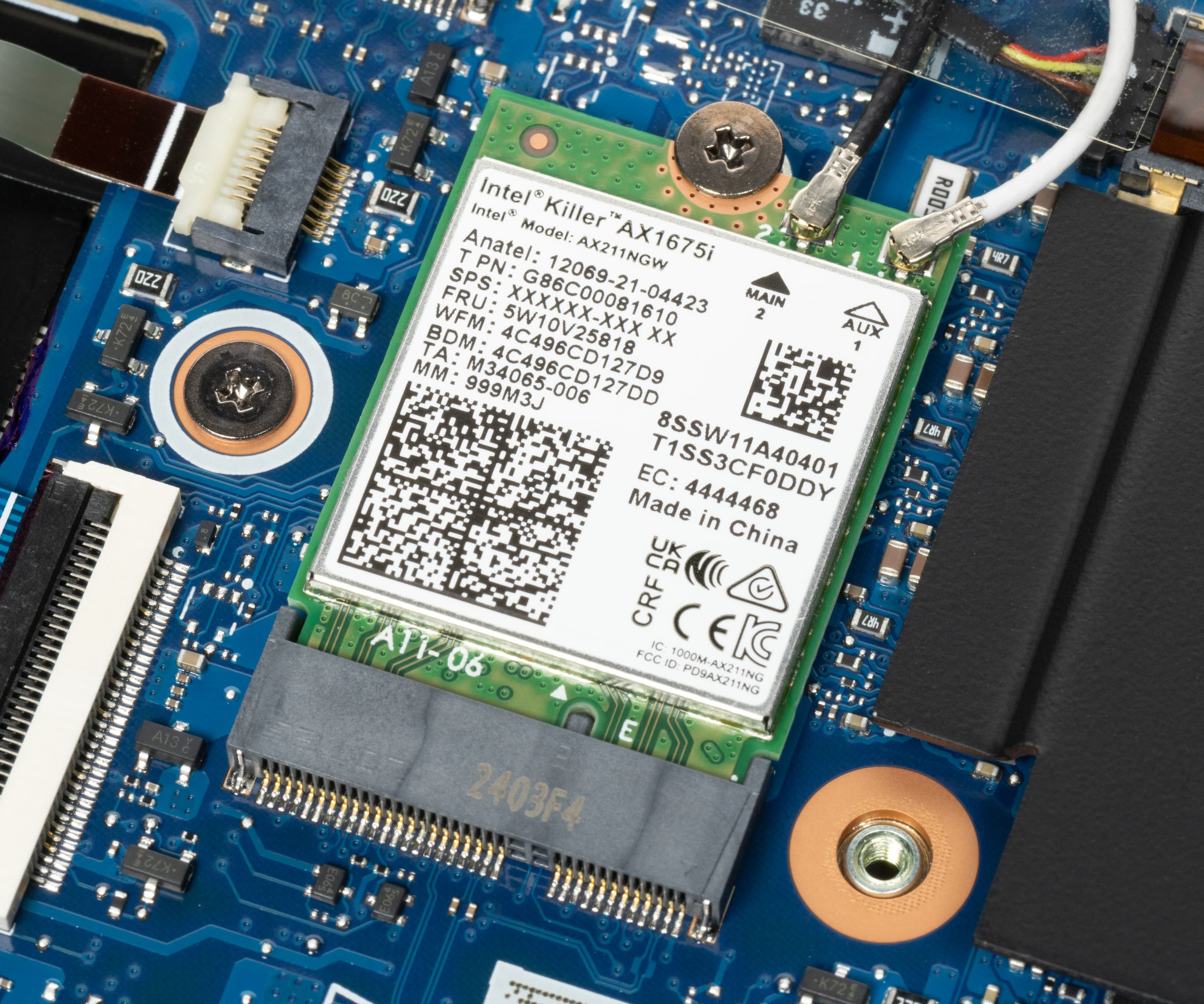 Адаптер беспроводной связи представлен трехдиапазонным (2,4/5/6 ГГц) устройством Intel Killer AX1675i (AX211NGW), соответствующим классу Wi-Fi 6E и стандарту 802.11ax.