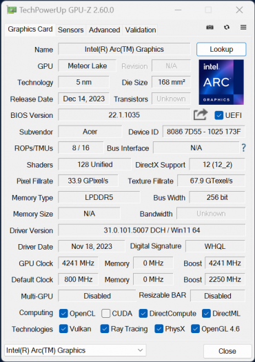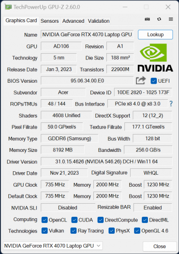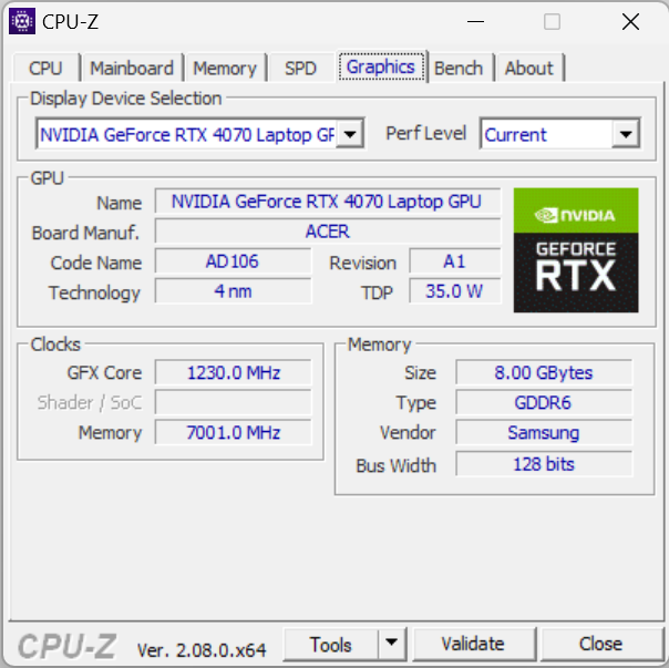 У главного вычислителя ноутбука Acer Swift X 14 имеется интегрированное графическое ядро Intel Arc Graphics, но для игр и приложений, умеющих задействовать дискретный видеоускоритель, установлена видеокарта Nvidia GeForce RTX 4070 Laptop. Сама Nvidia предоставляет производителю портативных машин решать вопрос о выборе мощности, потребляемой дискретным видеоускорителем, предусмотрев диапазон 35—115 Вт. Производитель установил планку на отметке 50 Вт. Нам в ходе тестирования под максимальной нагрузкой удалось получить на 20% больше — 60 Вт.