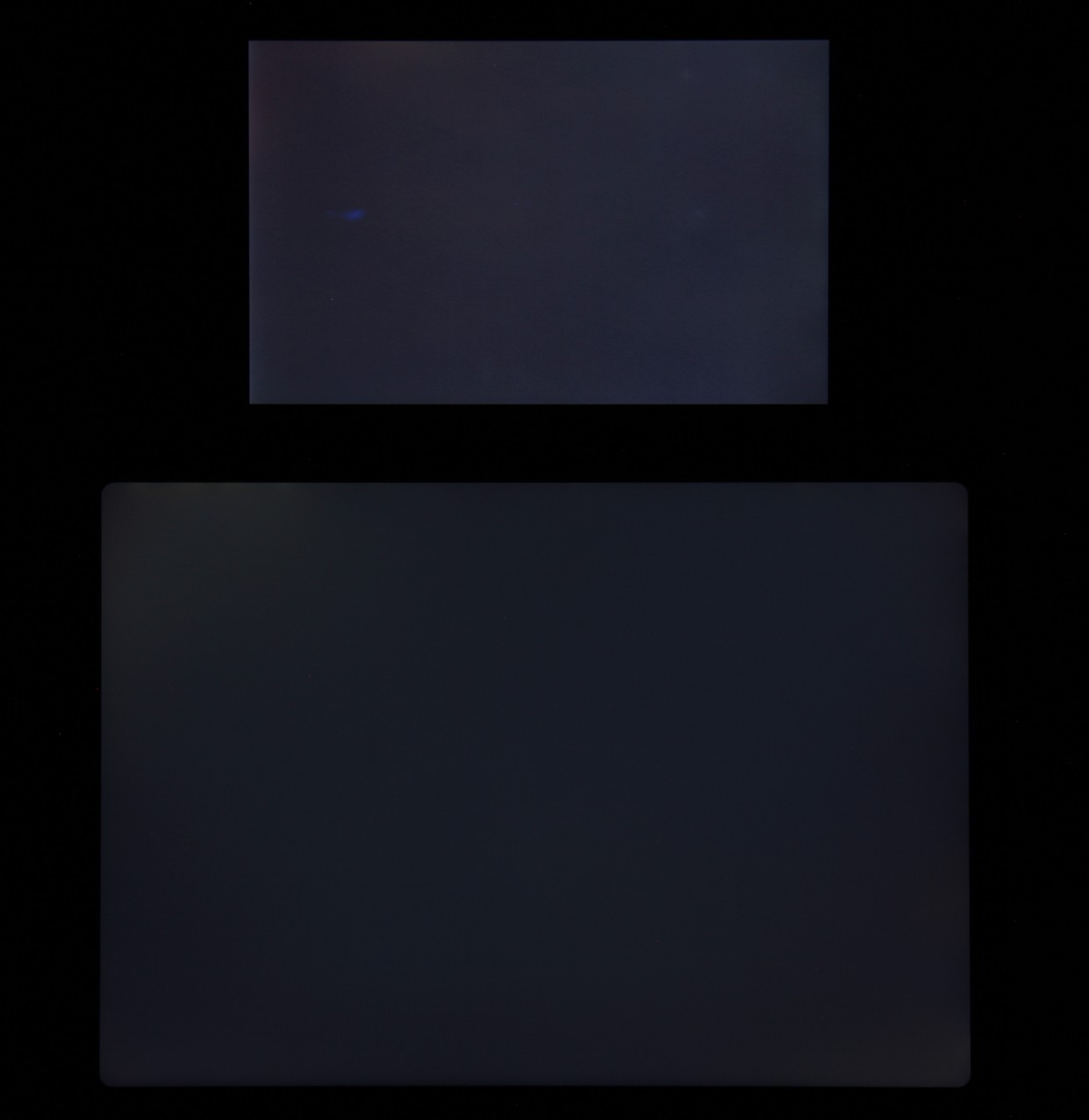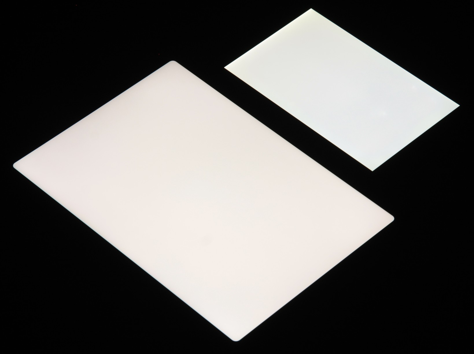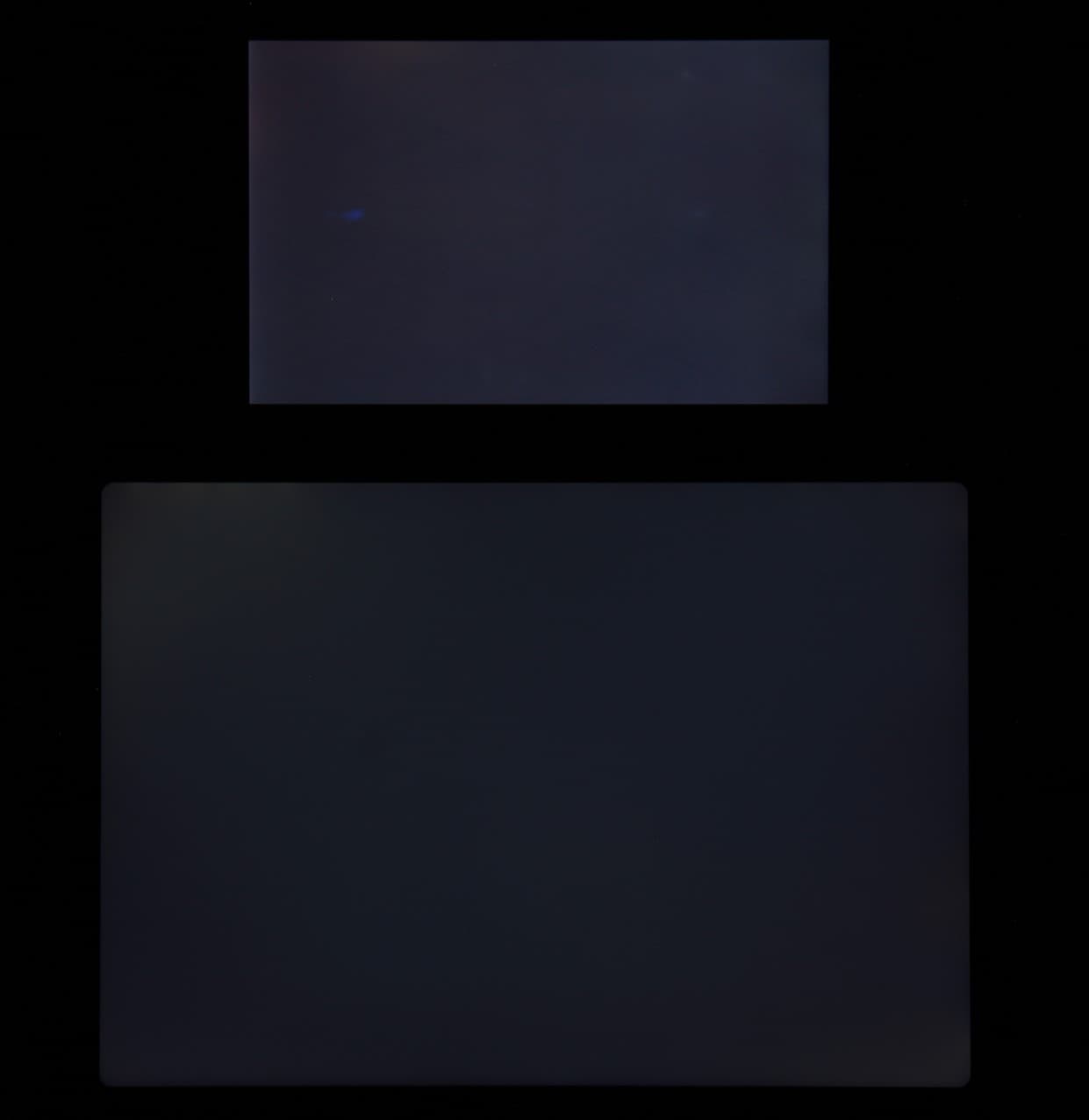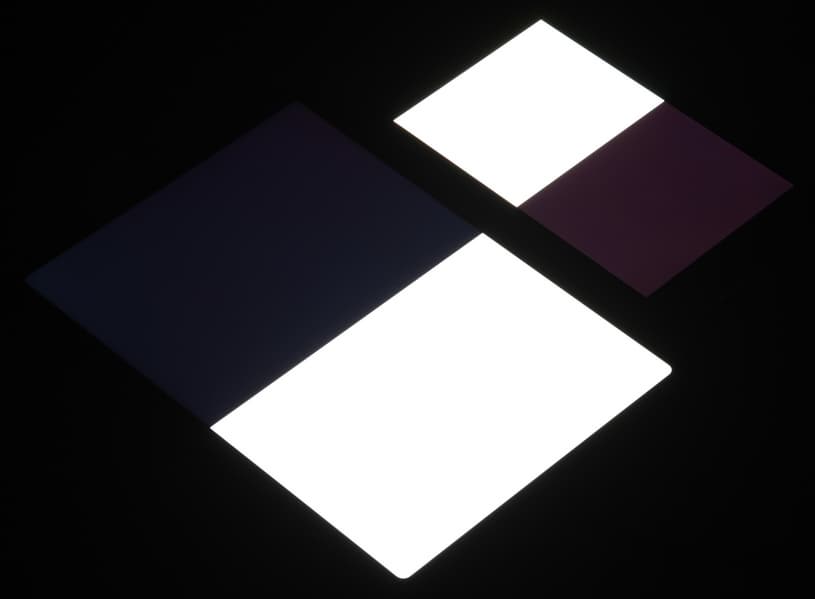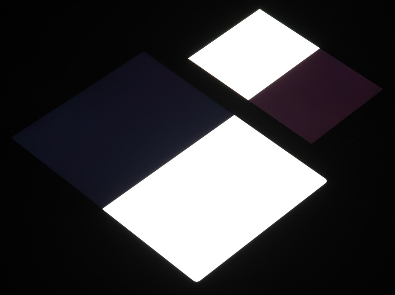 Яркость под углом у экранов уменьшилась (как минимум в 4 раза, исходя из разницы в выдержке), но в случае iPad Air падение яркости немного меньше. Черное поле при отклонении по диагонали высветляется слабо и приобретает фиолетовый оттенок. Фотографии ниже это демонстрируют (яркость белых участков в перпендикулярном плоскости экранов направлении примерно одинаковая!):