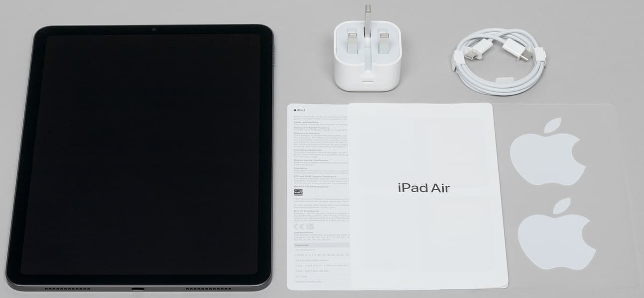 Комплектация самого iPad стандартна: листовки, зарядное устройство, кабель USB-C и наклейки. Зарядное устройство имеет повышенную мощность 20 Вт, но такая же была и у обычного iPad 2021 года.