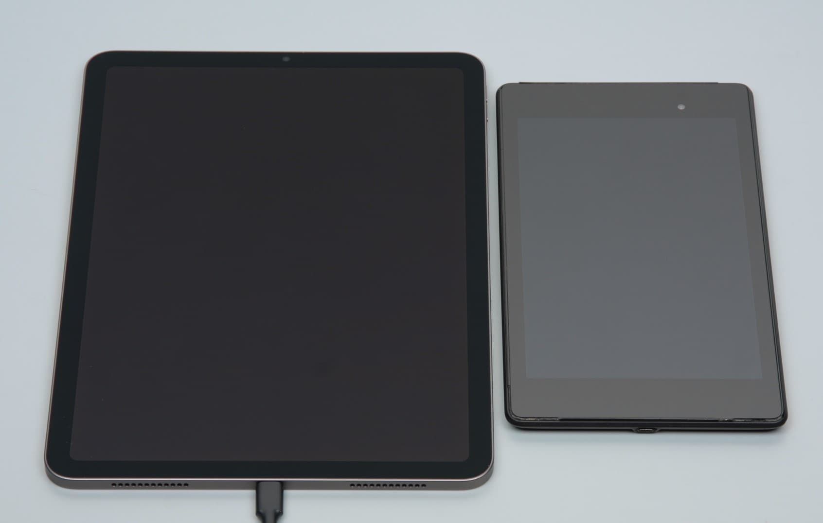 Лицевая поверхность экрана выполнена в виде стеклянной пластины с зеркально-гладкой поверхностью, устойчивой к появлению царапин. Судя по отражению объектов антибликовые свойства экрана гораздо лучше, чем у экрана Google Nexus 7 (2013) (далее просто Nexus 7). Для наглядности приведем фотографию, на которой в выключенных экранах отражается белая поверхность (справа — Nexus 7, слева — iPad Air, далее их можно различать по размеру):