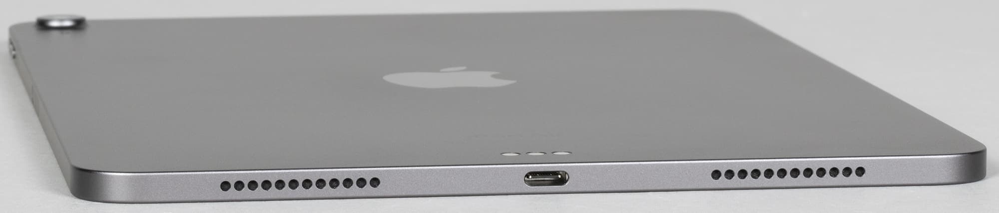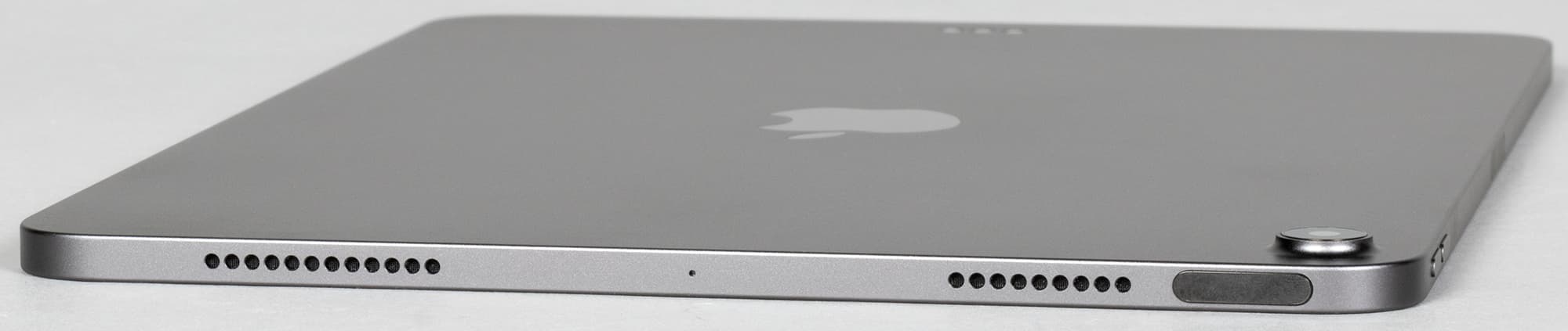 Рамка вокруг экрана одинаковая по ширине со всех сторон. Фронтальную камеру практически не видно. Контакты для подсоединения обложки-клавиатуры расположены на тыльной поверхности, под названием устройства. А коннектор для Apple Pencil — на правой грани по центру.
