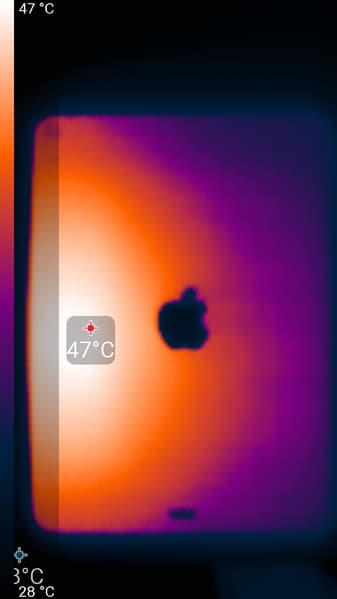 Ниже приведен теплоснимок задней поверхности, полученный после работы теста GFXBench Metal Battery Test (Manhattan 3.1) в течение примерно примерно 15 минут: