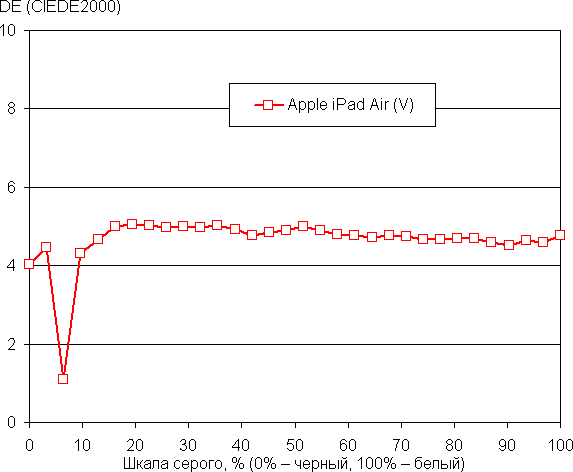 Баланс оттенков на шкале серого хороший, так как цветовая температура близка к стандартным 6500 К, а отклонение от спектра абсолютно черного тела (ΔE) меньше 10, что для потребительского устройства считается приемлемым показателем. При этом цветовая температура и ΔE мало изменяются от оттенка к оттенку — это положительно сказывается на визуальной оценке цветового баланса. (Самые темные области шкалы серого можно не учитывать, так как там баланс цветов не имеет большого значения, да и погрешность измерений цветовых характеристик на низкой яркости большая.)
