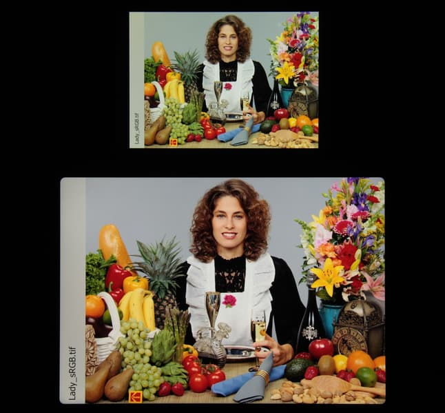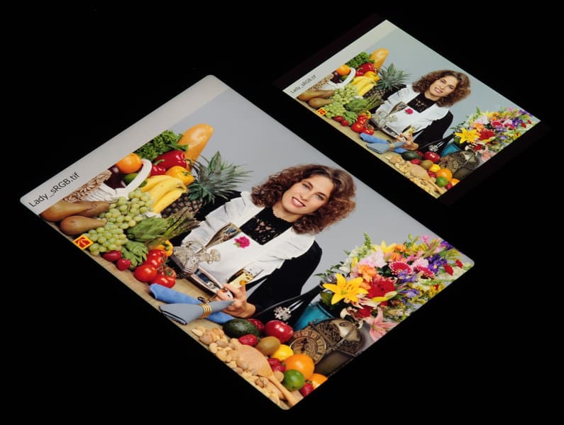 Это относится к тем изображениям, в которых прописан профиль sRGB или не прописано вообще никакого профиля. Однако родным для топовых современных устройств от Apple является цветовое пространство Display P3 с более насыщенными зеленым и красным цветами. Пространство Display P3 основано на SMPTE DCI-P3, но имеет точку белого D65 и гамма-кривую с показателем примерно 2,2. Кроме того, производитель заявляет, что начиная с iOS 9.3 на системном уровне поддерживается управление цветом, это облегчает приложениям под iOS правильно выводить на экран изображения с прописанным цветовым профилем. Действительно, дополнив тестовые изображения (файлы JPG и PNG) профилем Display P3, мы получили цветовой охват, шире sRGB (вывод в Safari):