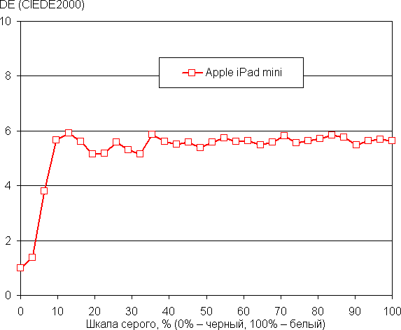 Баланс оттенков на шкале серого хороший, так как цветовая температура близка к стандартным 6500 К, а отклонение от спектра абсолютно черного тела (ΔE) меньше 10, что для потребительского устройства считается приемлемым показателем. При этом цветовая температура и ΔE мало изменяются от оттенка к оттенку — это положительно сказывается на визуальной оценке цветового баланса. (Самые темные области шкалы серого можно не учитывать, так как там баланс цветов не имеет большого значения, да и погрешность измерений цветовых характеристик на низкой яркости большая.)
