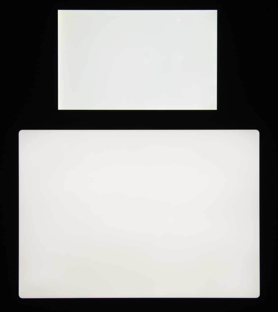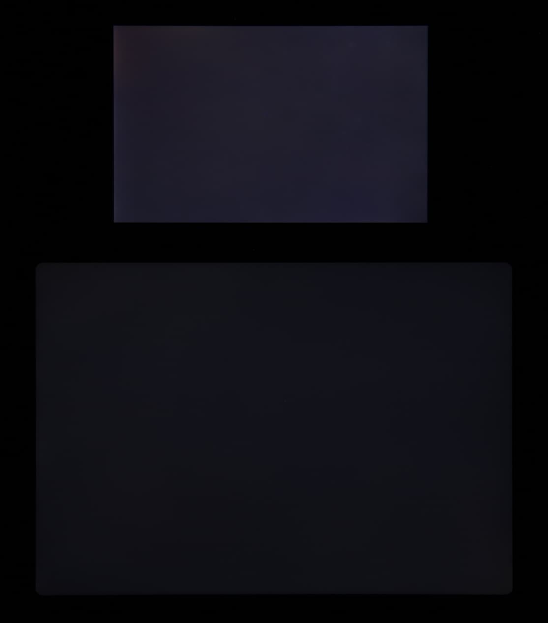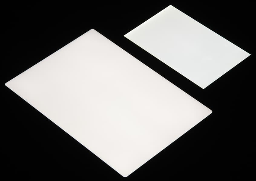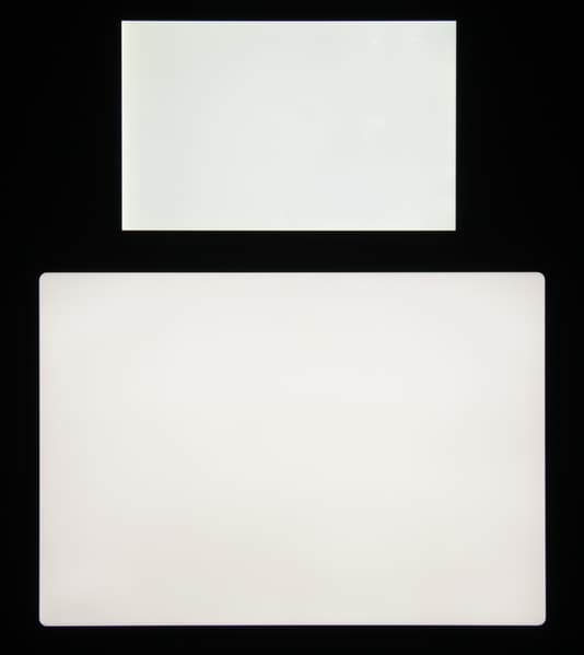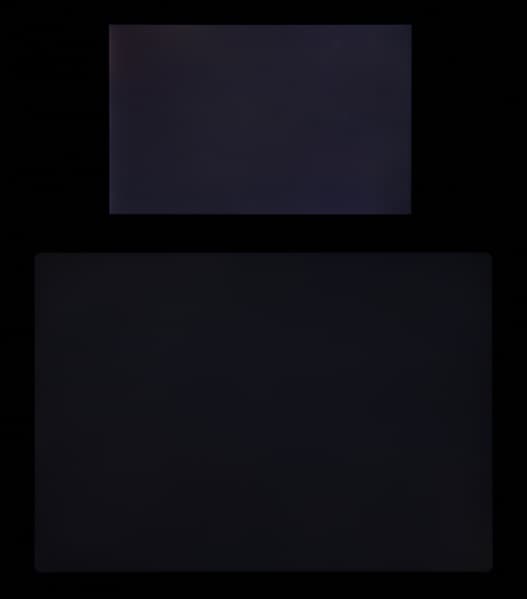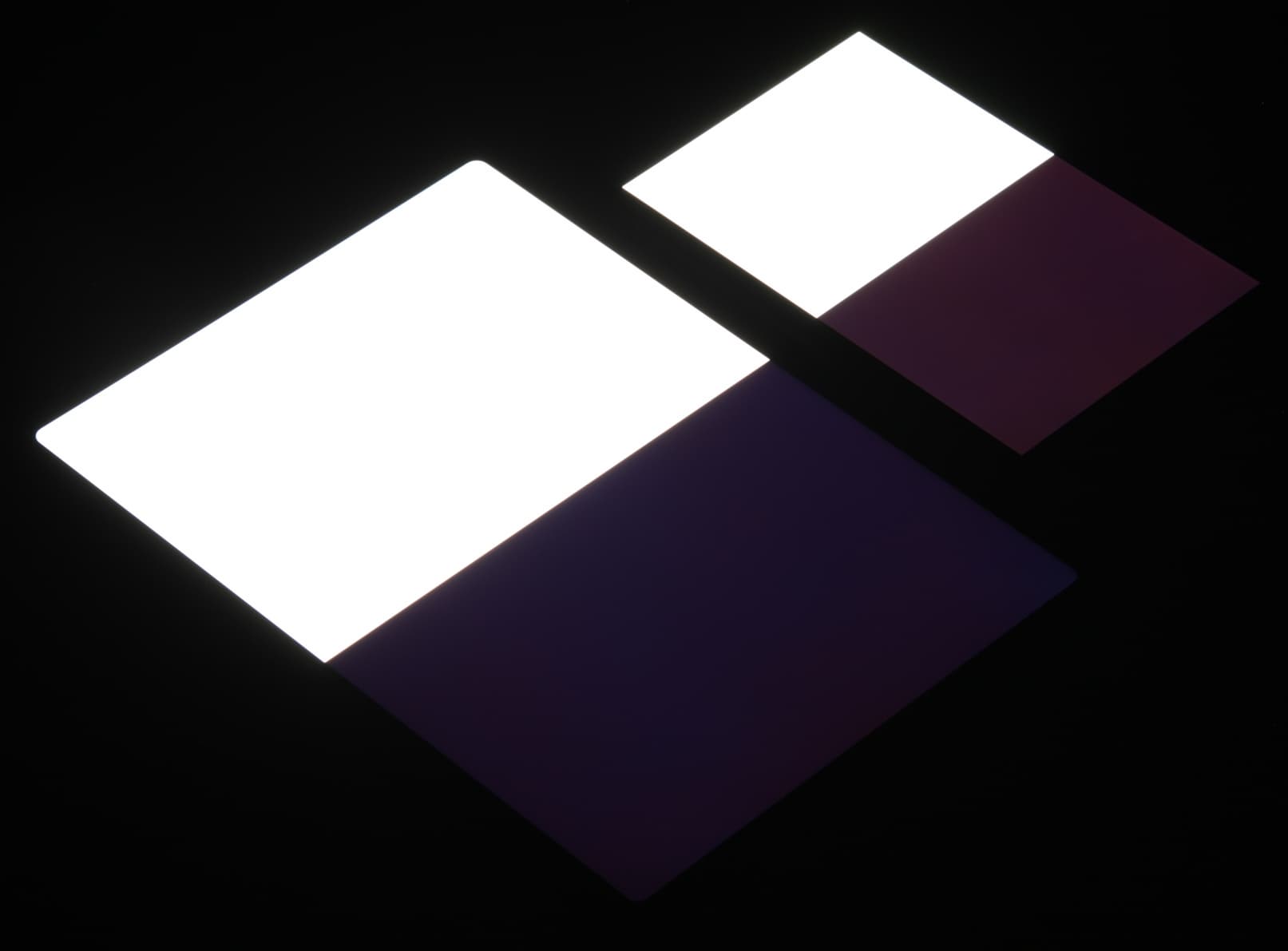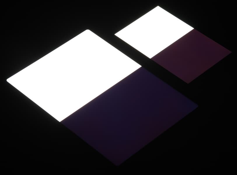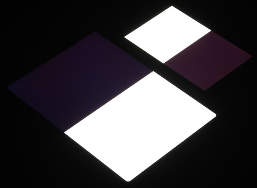 Яркость под углом у экранов уменьшилась (как минимум в 5 раз, исходя из разницы в выдержке), но в случае Apple iPad Pro 11″ (2020) падение яркости чуть меньше. Черное поле при отклонении по диагонали высветляется очень слабо и приобретает фиолетовый оттенок. Фотографии ниже это демонстрируют (яркость белых участков в перпендикулярном плоскости экранов направлении примерно одинаковая!):