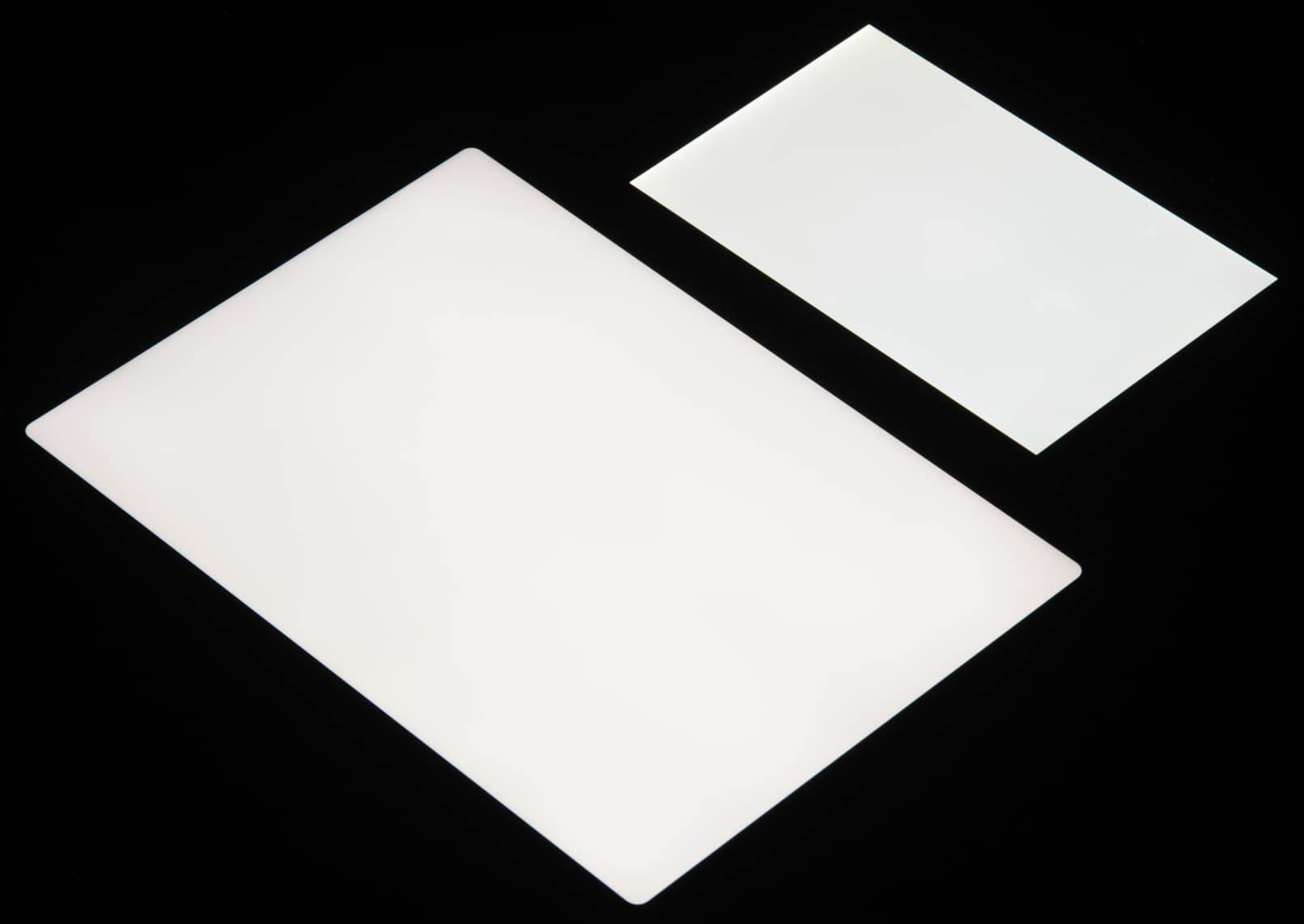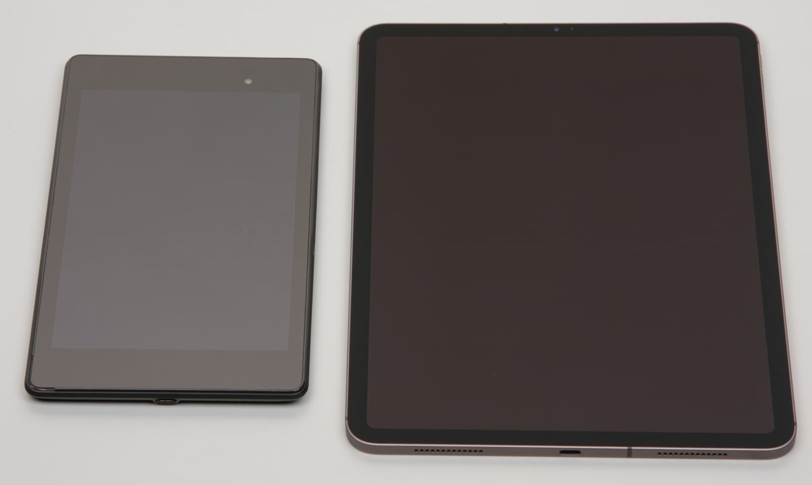 Лицевая поверхность экрана выполнена в виде стеклянной пластины с зеркально-гладкой поверхностью, устойчивой к появлению царапин. Судя по отражению объектов, антибликовые свойства экрана гораздо лучше, чем у экрана Google Nexus 7 (2013) (далее просто Nexus 7). Для наглядности приведем фотографию, на которой в выключенных экранах отражается белая поверхность (слева — Nexus 7, справа — Apple iPad Pro 11″ (2020), далее их можно различать по размеру):