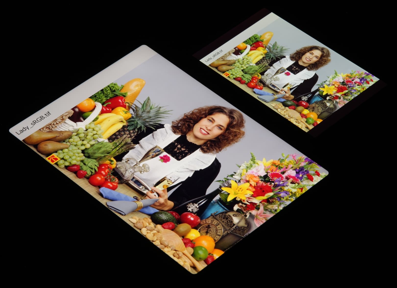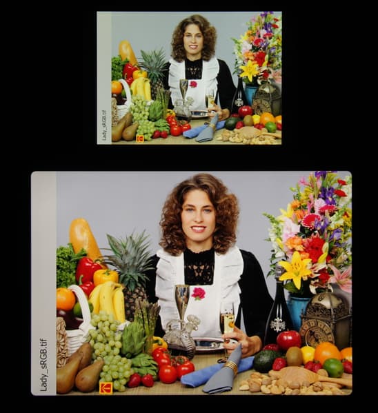 Эта коррекция выполняется в случае тех изображений, в которых прописан профиль sRGB или не прописано вообще никакого профиля. Однако родным для топовых современных устройств Apple является цветовое пространство Display P3 с более насыщенными зеленым и красным цветами. Пространство Display P3 основано на SMPTE DCI-P3, но имеет точку белого D65 и гамма-кривую с показателем примерно 2,2. Кроме того, производитель заявляет, что начиная с iOS 9.3 на системном уровне поддерживается управление цветом, это помогает приложениям под iOS правильно выводить на экран изображения с прописанным цветовым профилем. Действительно, дополнив тестовые изображения (файлы JPG и PNG) профилем Display P3, мы получили цветовой охват шире sRGB (вывод в Safari):