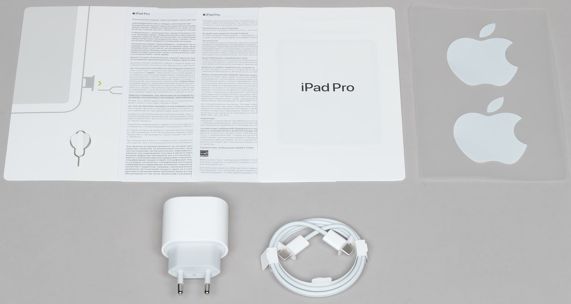 Внутри коробки мы найдем традиционный набор: кабель USB-C (на обоих концах), зарядное устройство мощностью 18 Вт (5 В 3 А или 9 В 2 А) и конверт с листовками, к одной из которых прикреплена скрепка для извлечения SIM-карты.