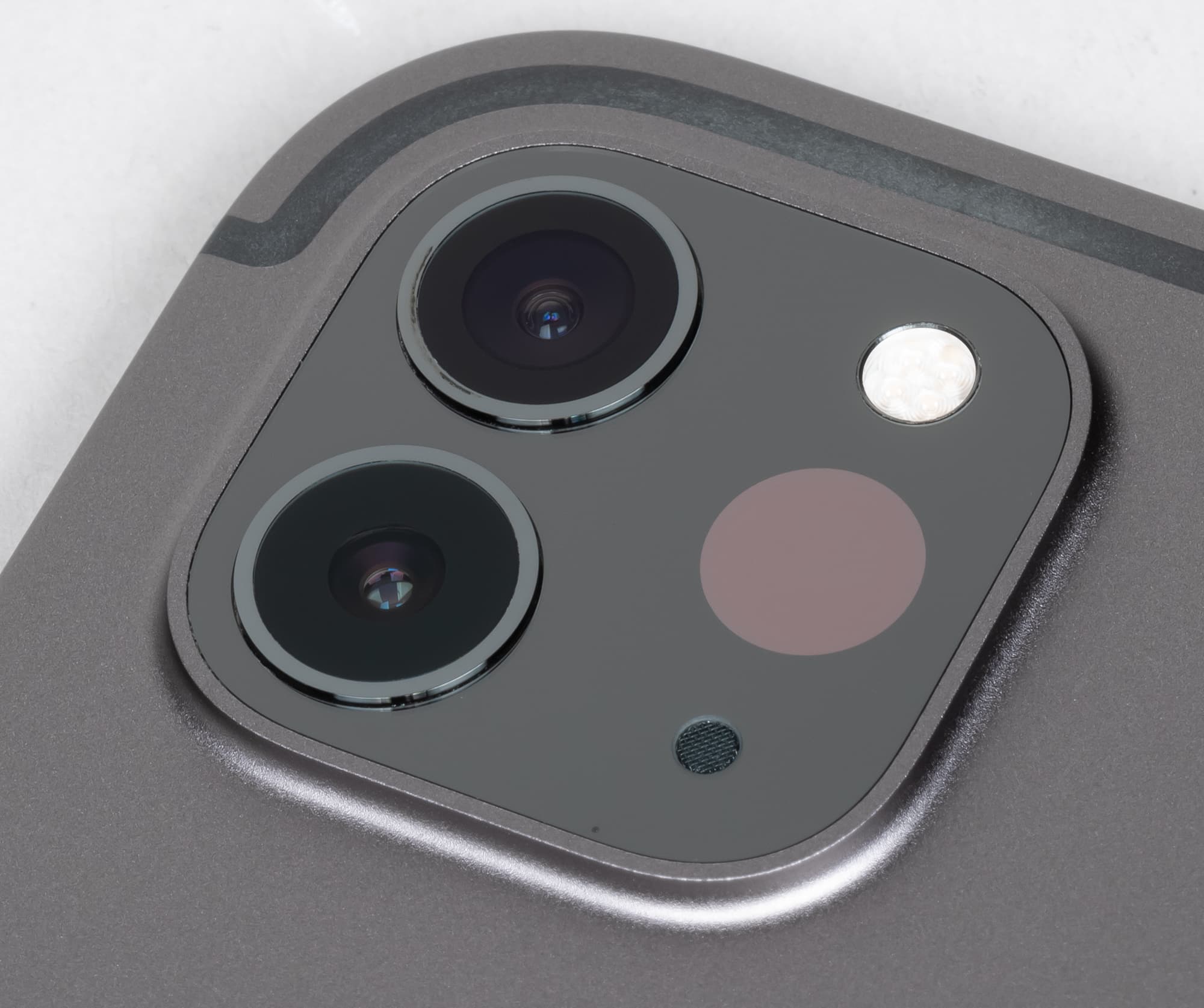 Иное дело — тыльная сторона. Здесь как раз и можно увидеть единственное — но важное — отличие. Это блок камеры. Раньше камера была одна, а вспышка располагалась под ней как отдельный элемент. Теперь камер две, и вместе со вспышкой и сканером LiDAR они размещены на выступающей квадратной «платформе» из темного зеркального стекла.