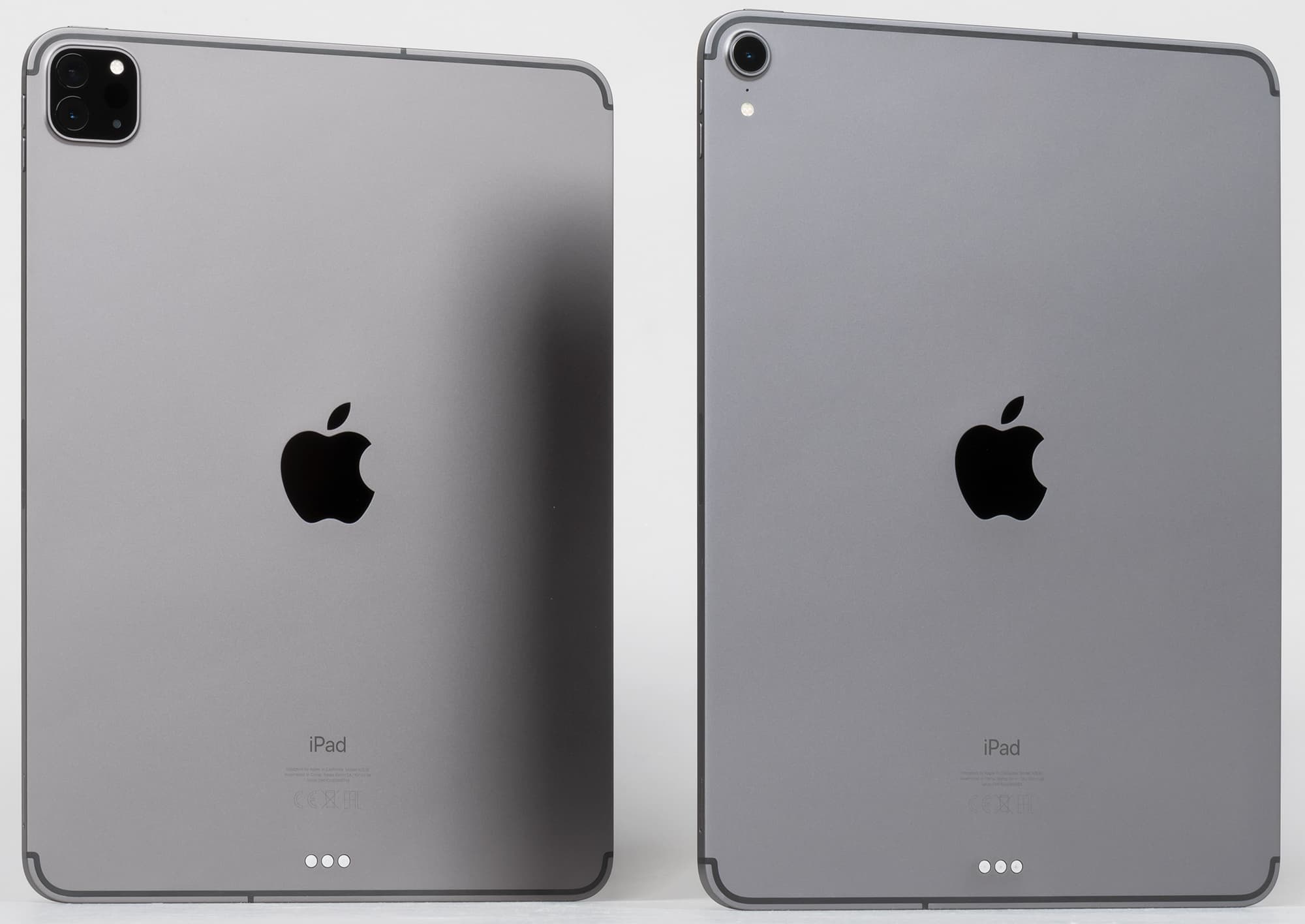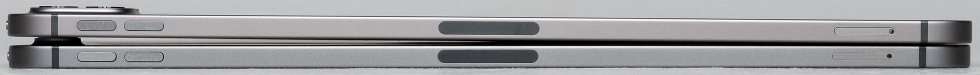 Набор кнопок и разъемов, а также их расположение — опять-таки идентичны. На фото ниже — iPad Pro двух поколений. Хорошо видно, что правая грань у них абсолютно одинакова.