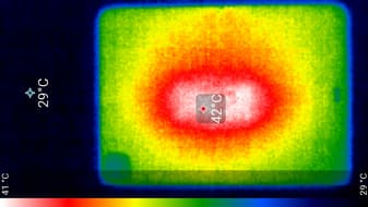 При высоких нагрузках планшет немного нагревается, но серьезного дискомфорта это доставить не может. Ниже приведен теплоснимок задней поверхности, полученный после нескольких запусков подряд (примерно 10 минут работы) теста Basemark Metal: