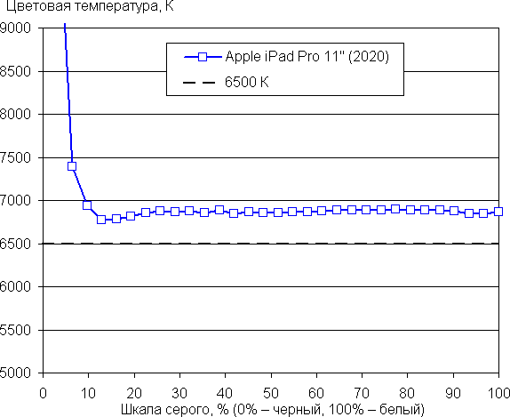 Баланс оттенков на шкале серого хороший, так как цветовая температура близка к стандартным 6500 К, а отклонение от спектра абсолютно черного тела (ΔE) меньше 10, что для потребительского устройства считается приемлемым показателем. При этом цветовая температура и ΔE мало изменяются от оттенка к оттенку — это положительно сказывается на визуальной оценке цветового баланса. Характер изменения величин от оттенка к оттенку косвенно показывает, что используется программная коррекция цветопередачи. (Самые темные области шкалы серого можно не учитывать, так как там баланс цветов не имеет большого значения, да и погрешность измерений цветовых характеристик на низкой яркости большая.)