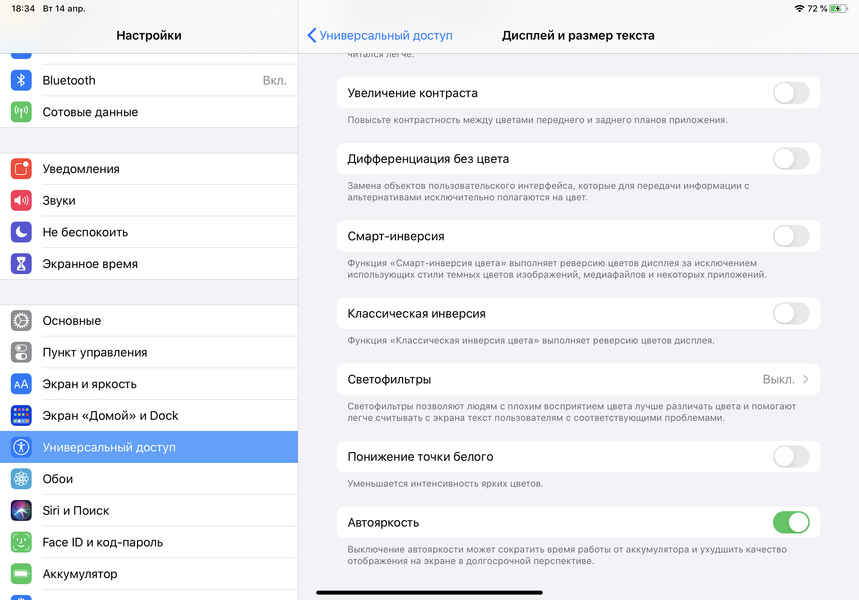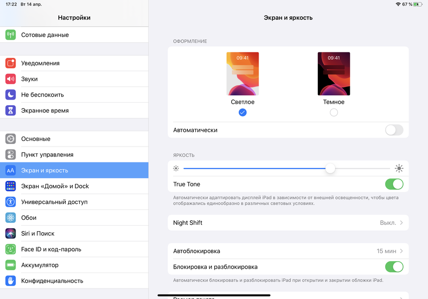 Разумеется, в этом устройстве Apple есть уже привычная функция Night Shift, которая ночью делает картинку теплее (насколько теплее — указывает пользователь, по факту это от 6270 К до 2790 К). Описание того, почему такая коррекция может быть полезной, приведено в статье про iPad Pro 9,7″. В любом случае, при развлечении с планшетом на ночь глядя лучше снизить яркость экрана до низкого, но еще комфортного уровня, а желтить экран настройкой Night Shift нет никакого смысла.