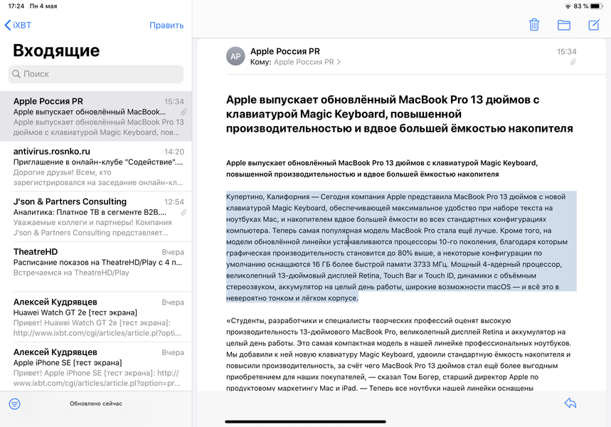 Прекрасно работают жесты, привычные пользователям macOS: прокрутка двумя пальцами, горизонтальное смахивание двумя пальцами, вызов контекстного меню одновременным касанием двумя пальцами («правая кнопка мыши») и так далее. Таким образом, iPad стал еще немного ближе к ноутбуку.