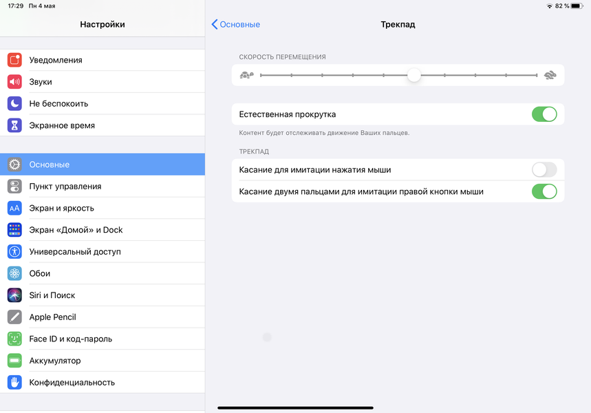 Теперь же эта опция реализована полноценно, и искать ее не придется. Достаточно либо подключить к iPad по Bluetooth мышь или трекпад, либо подсоединить его к новейшей клавиатуре Magic Keyboard (ей мы посвятим отдельную статью). Мы использовали iPad Pro с Apple TrackPad. В «Настройках» можно отрегулировать скорость перемещения курсора и направление прокрутки, а также включить касание для имитации нажатия.