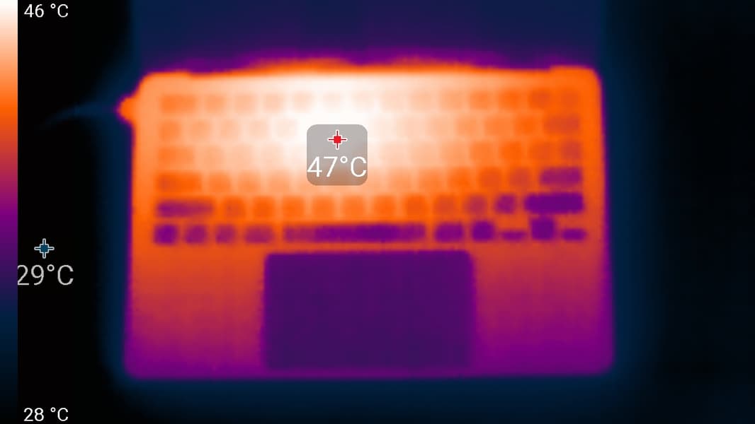 Максимальный нагрев — условно в центре клавиатуры. Впрочем, и там, где обычно находятся запястья пользователя, нагрев хорошо чувствуется, что снижает комфорт от работы за ноутбуком.