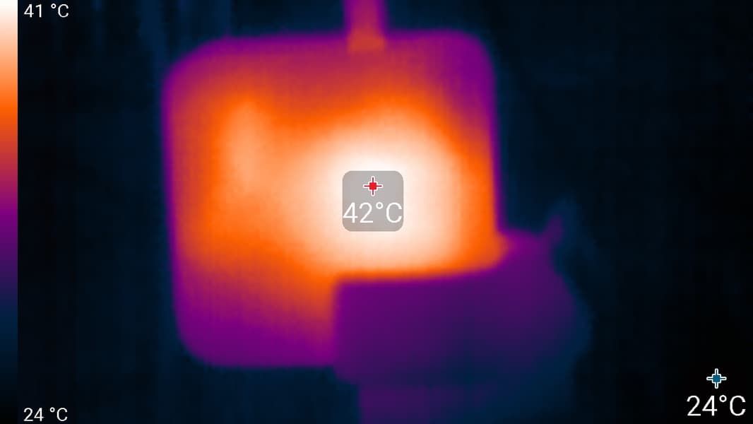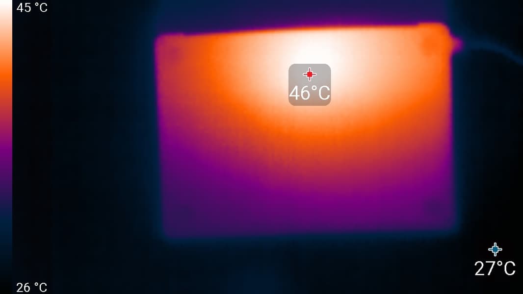 Нагрев снизу довольно высокий. Если держать ноутбук на коленях, то тепло чувствуется, в жару так работать будет некомфортно. Потребление от сети (аккумулятор предварительно заряжен до 100%) в этом тесте равно 20 Вт при долговременной нагрузке и порядка 31 Вт в самом начале. Блок питания при этом нагрелся несильно, но все равно лучше при долговременной работе с высокой производительностью следить, чтобы он не был ничем накрыт.