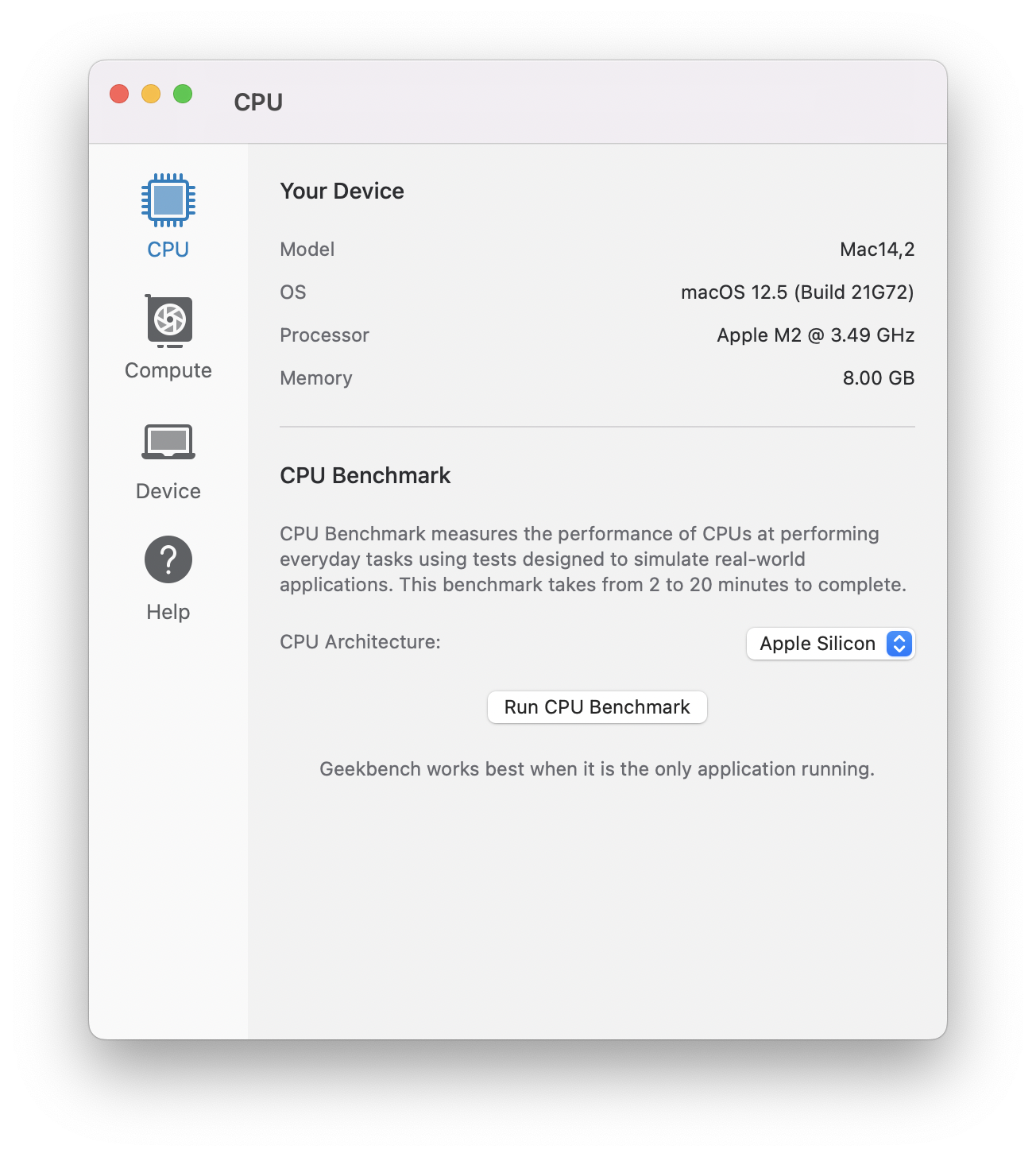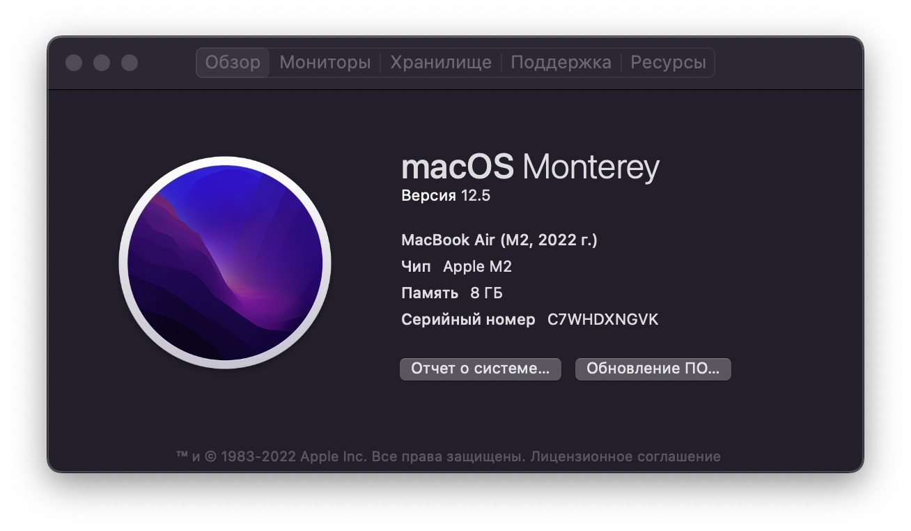 Основа ноутбука, попавшего к нам на тест — восьмиядерная однокристальная система (SoC) Apple M2, в которой четыре ядра высокопроизводительные, а четыре других — энергосберегающие. В этом плане M2 идентична M1, хотя частоты различаются. Но, как и раньше, Apple даже в информации операционной системы не указывает частоту CPU-ядер.