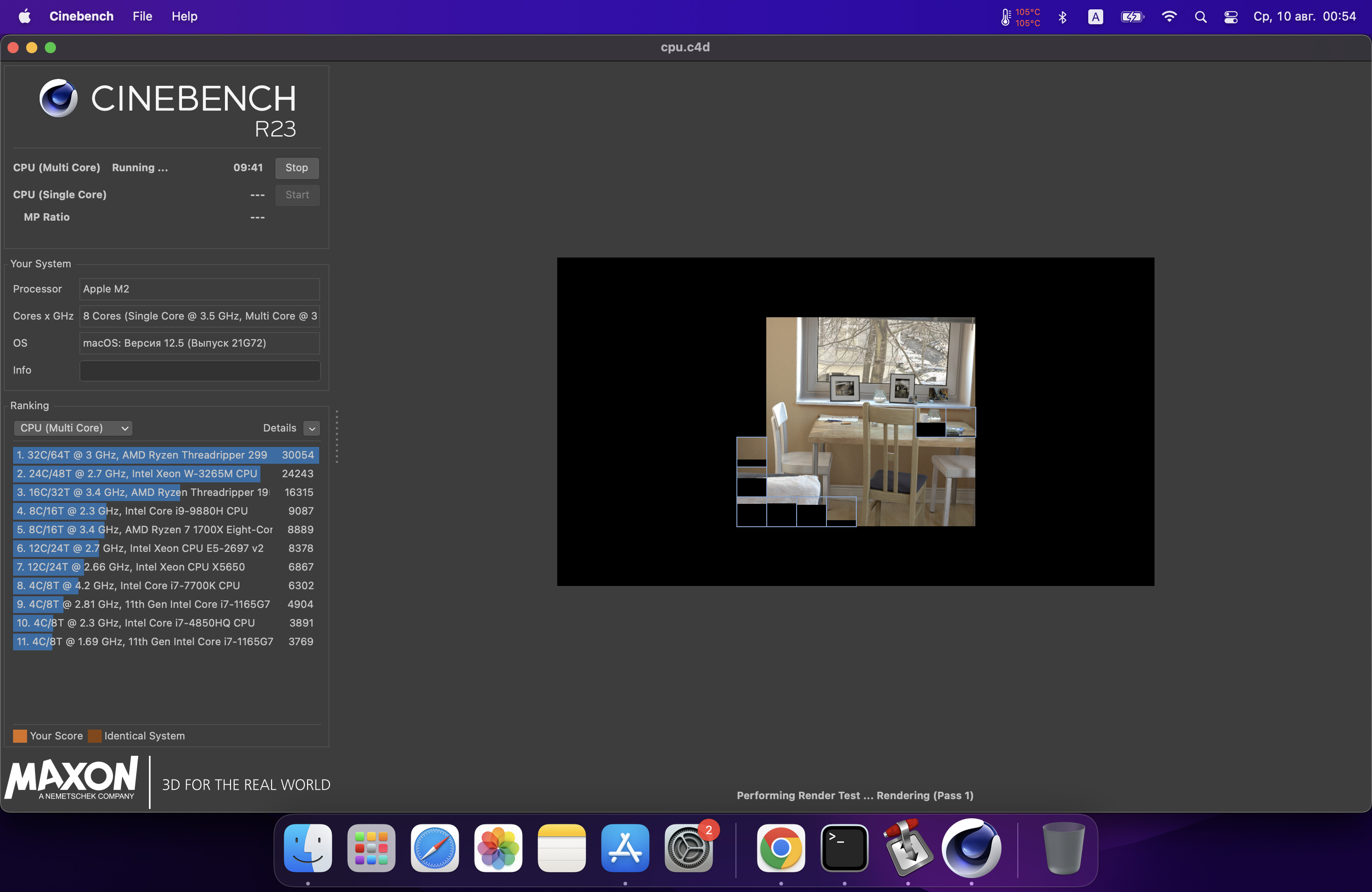 Прежде, чем мы перейдем к цифрам, опишем здесь поведение нового MacBook Air словами. В приложениях, разработанных Apple, ноутбук стремительно нагревался (выше 100 градусов за полминуты и даже быстрее), после чего какое-то непродолжительное время работал в таком режиме, а потом сбрасывал частоты, резко замедляя работу, но и опуская температуру до относительно приемлемой. А вот когда мы запускали сторонние приложения, ноутбук грелся, как печка, но не снижал частоты. Как минимум, это опасно для устройства. Мы впервые за много лет видим нагрев CPU до 108-109 градусов. И можно только гадать, как долго (точнее, как недолго) MacBook Air сможет прожить в таком режиме. При этом и существенного прироста относительно Apple M1 мы не получили.
