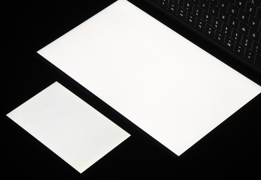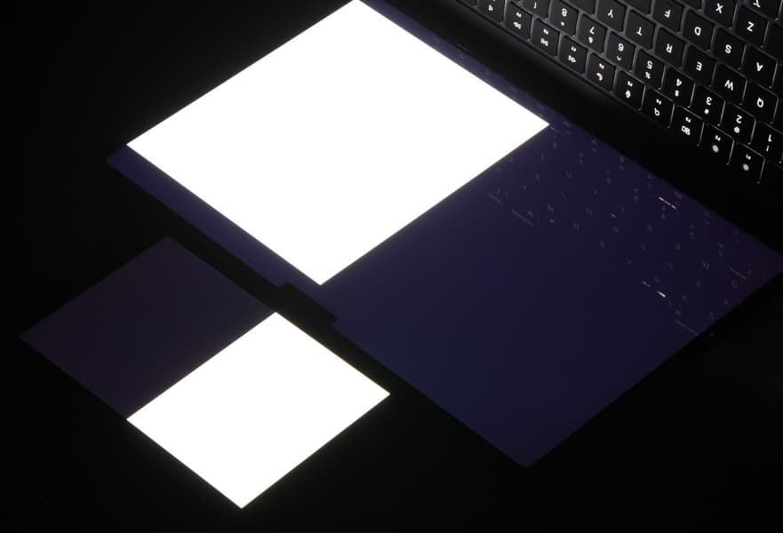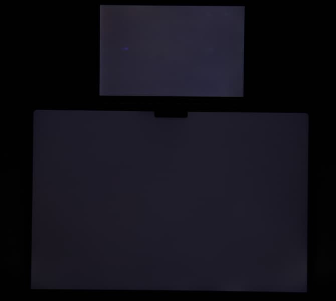 Яркость под этим углом у обоих экранов заметно уменьшилась (выдержка увеличена в 5 раз), но экран ноутбука все же немного светлее. Черное поле при отклонении по диагонали высветляется слабо и приобретает легкий красно-фиолетовый оттенок. Фотография ниже это демонстрирует (яркость белых участков в перпендикулярном плоскости экранов направлении примерно одинаковая!):