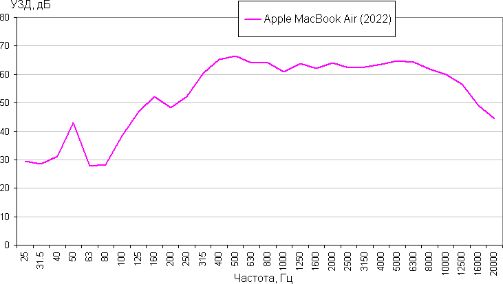Измерение максимальной громкости встроенных громкоговорителей проводилось при воспроизведении звукового файла с розовым шумом. Максимальная громкость оказалась равна 75,0 дБА. Среди ноутбуков, протестированных к моменту написания данной статьи (минимум 64,8 дБА, максимум 83 дБА, среднее 74,0 дБА, медиана 74,4 дБА), этот ноутбук немного громче среднего по громкости.