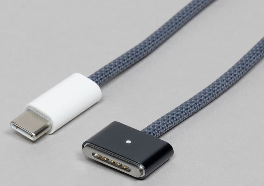 Добавим, что белый штекер на конце синего кабеля выглядит, конечно, весьма странно. Но не будем придираться. Главное, что коннектор MagSafe очень удобный: примагничивается плотно и сидит как влитой.
