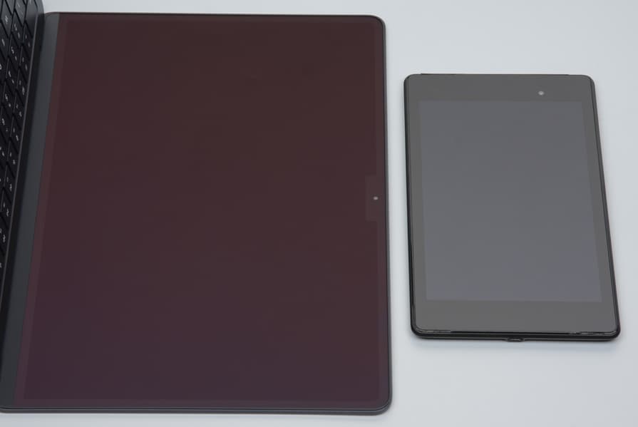 Экран имеет хорошие углы обзора без значительного сдвига цветов даже при больших отклонениях взгляда от перпендикуляра к экрану и без инвертирования оттенков. Для сравнения приведем фотографии, на которых на экраны ноутбука и Nexus 7 выведены одинаковые изображения, при этом яркость экранов изначально установлена примерно на 200 кд/м² (по белому полю во весь экран), а цветовой баланс на фотоаппарате принудительно переключен на 6500 К. Перпендикулярно к экранам белое поле:
