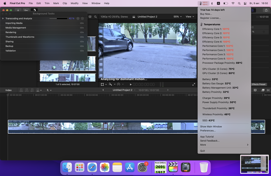 Еще одна процессорная задача — кодирование видео с помощью HandBrake 1.3.3, который пока не оптимизирован для Apple M1 и, следовательно, запускается через Rosetta 2.