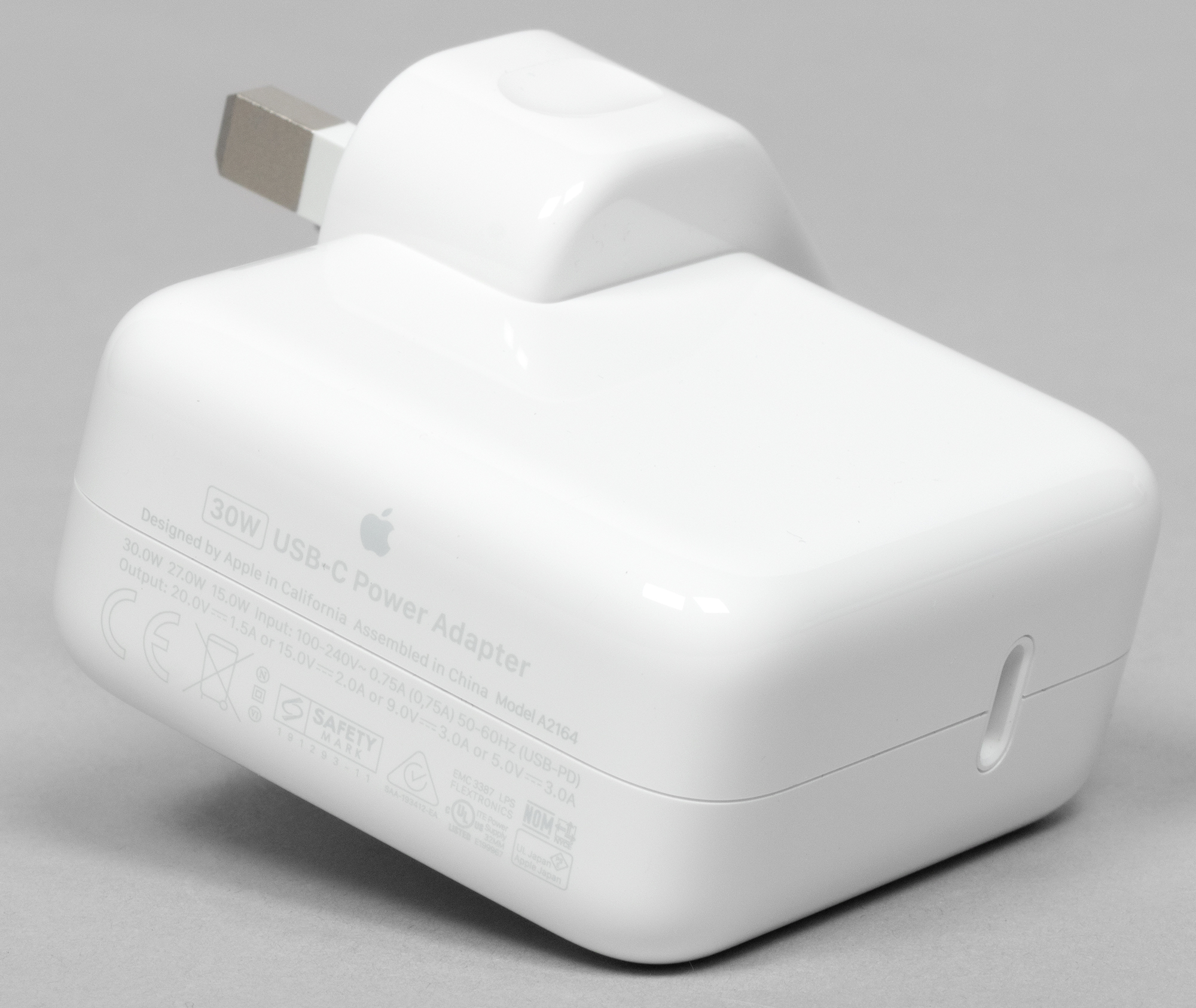Ну и на всякий случай напомним, что поскольку официальных поставок продукции Apple в Россию сейчас нет, и новинки поступают в основном через другие страны, для вилки может потребоваться переходник. В нашем случае она была британского типа, то есть с тремя штырьками (третий — заземление).