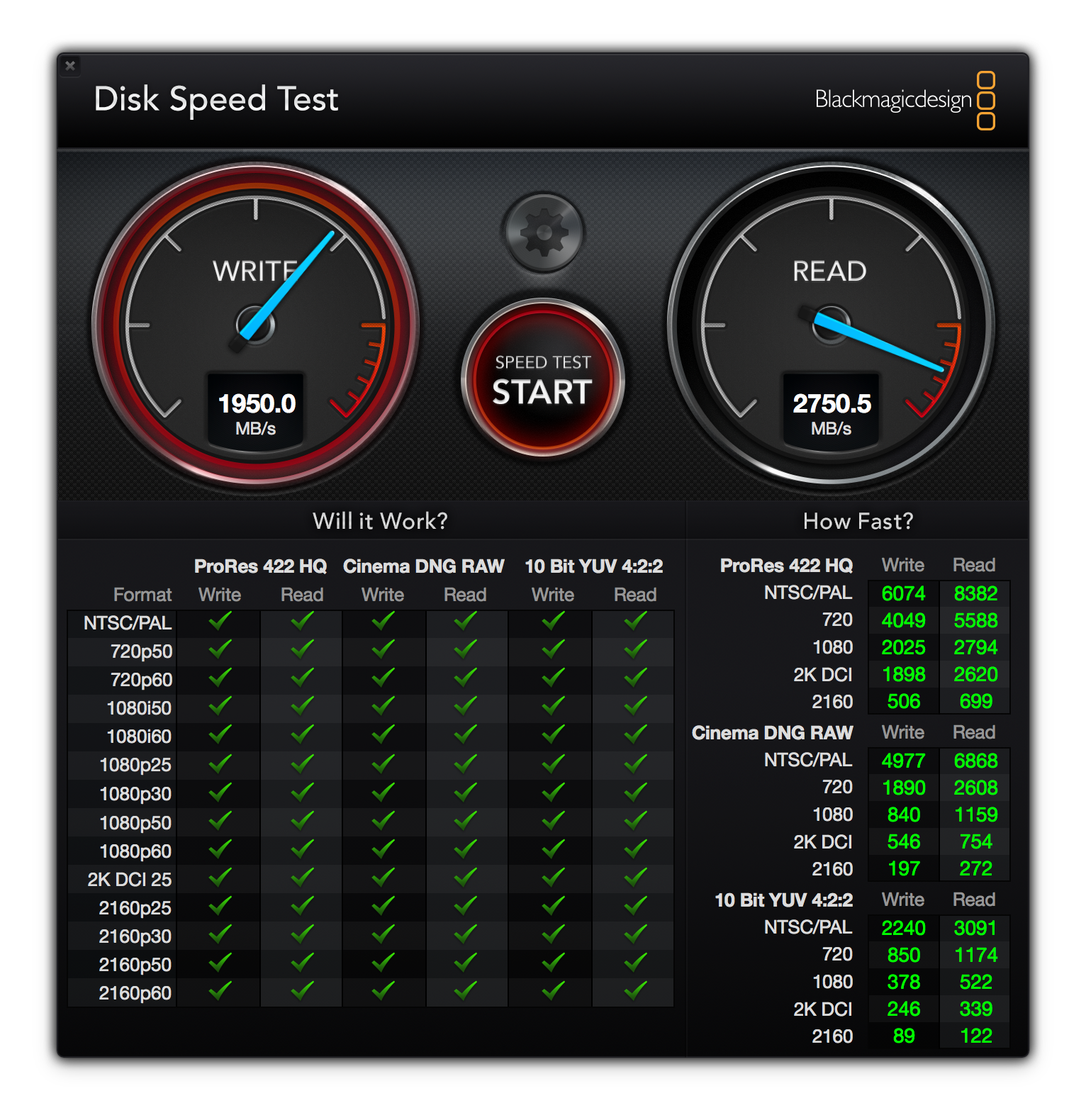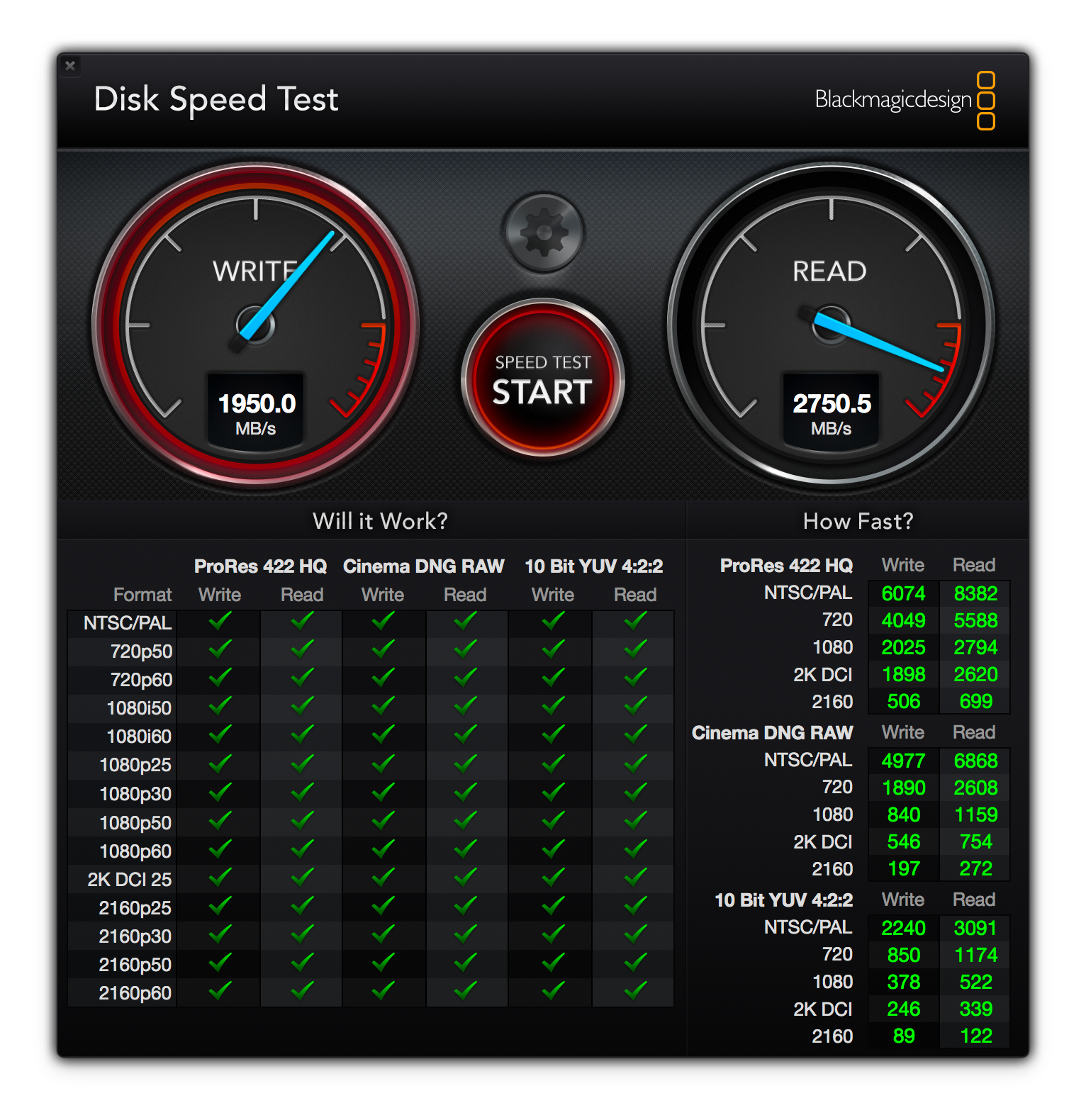 Если перечисленные выше бенчмарки помогают нам оценить производительность CPU и GPU, то BlackMagic Disk Speed ориентирован на тестирование накопителя: он измеряет скорости чтения и записи файлов.